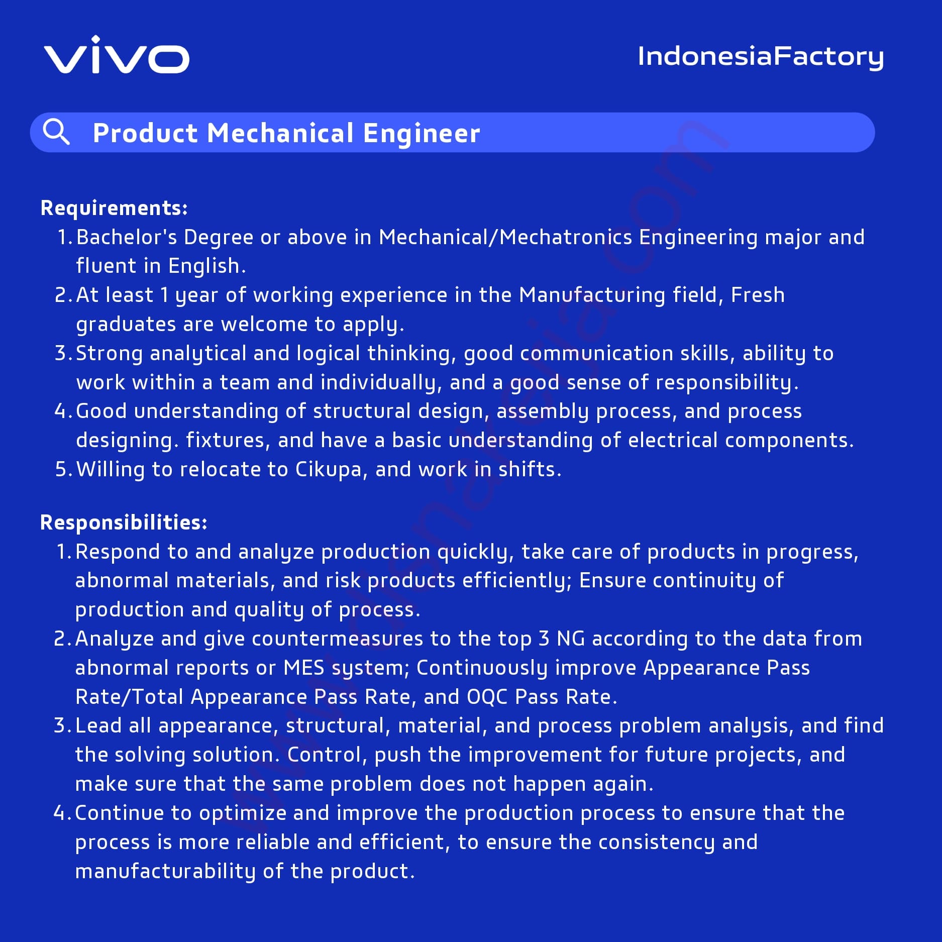 - At least 1 year of working experience in the menufacturing field, fresh graduates are welcome to apply