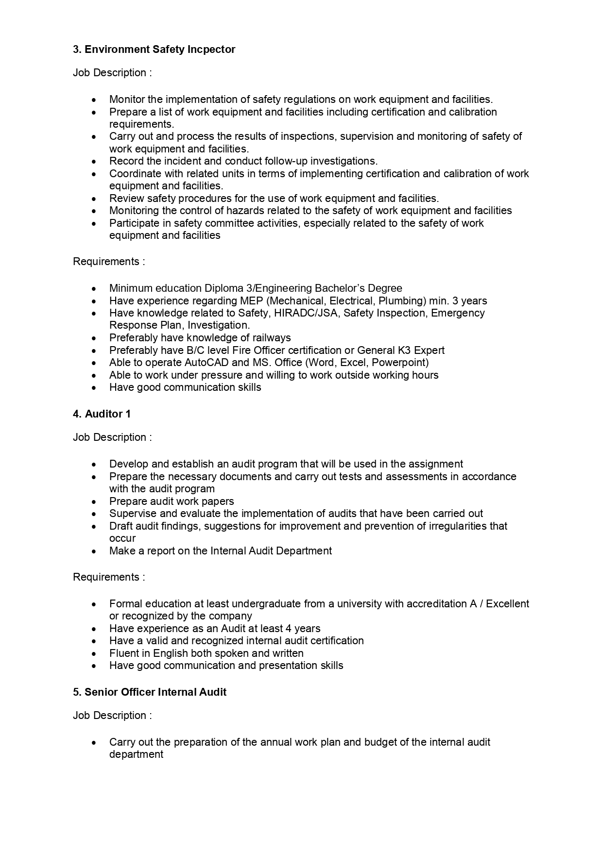 Have knowledge related to Safety, HIRADC/JSA, Safety Inspection, Emergency Response Plan, Investigation.