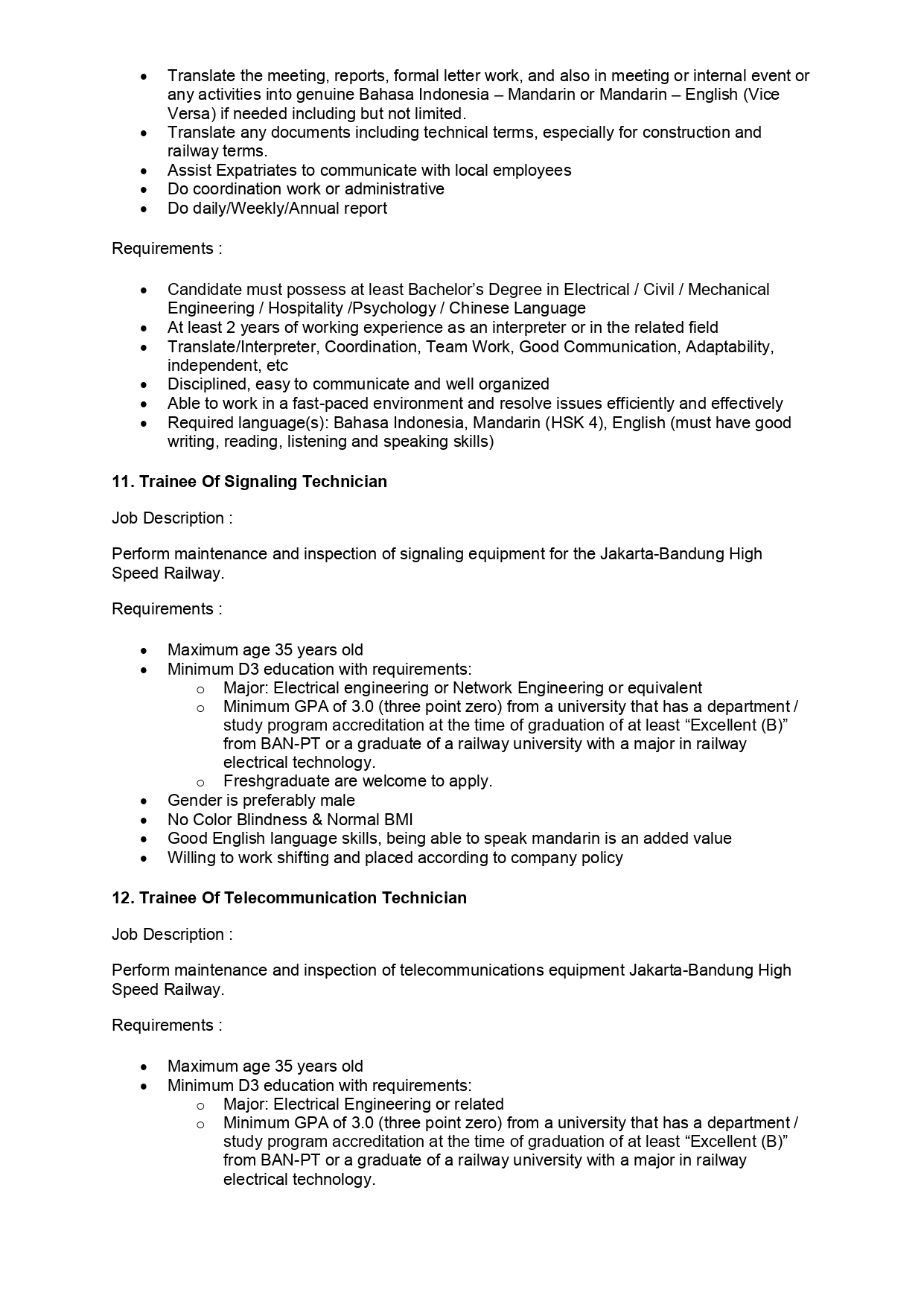 Required language(s): Bahasa Indonesia, Mandarin (HSK 4), English (must have good writing, reading, listening and speaking skills)