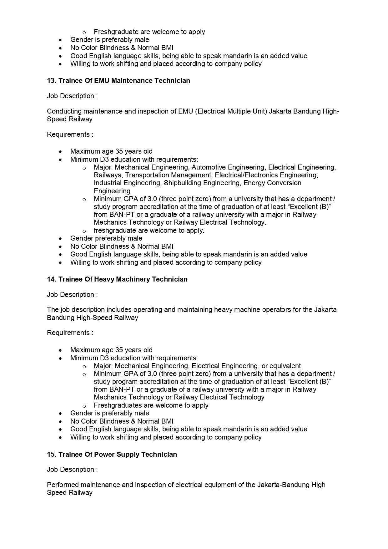 o Minimum GPA of 3.0 (three point zero) from a university that has a department / study program accreditation at the time of graduation of at least “Excellent (B)” from BAN-PT or a graduate of a railway university with a major in Railway Mechanics Technology or Railway Electrical Technology