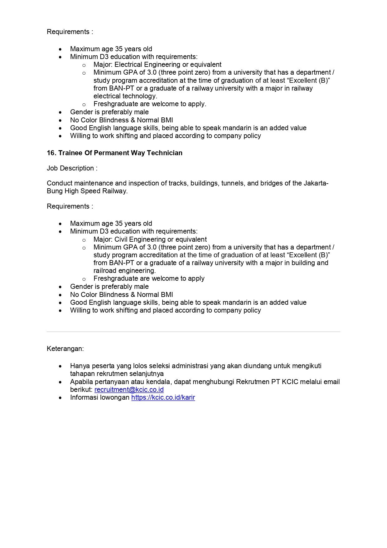- Apabila pertanyaan atau kendala, dapat menghubungi Rekrutmen PT KCIC melalui email berikut: recruitment@kcic.co.id