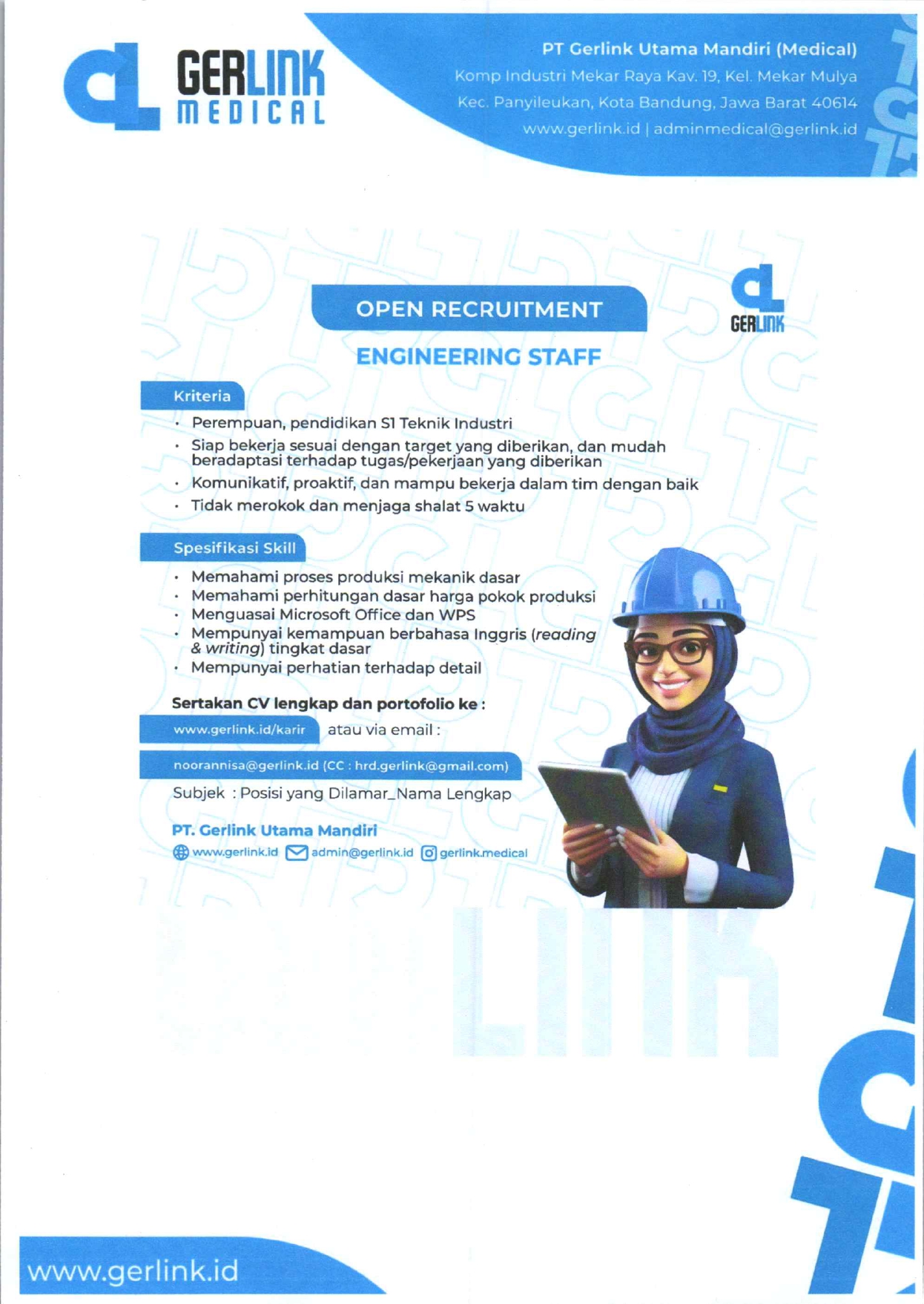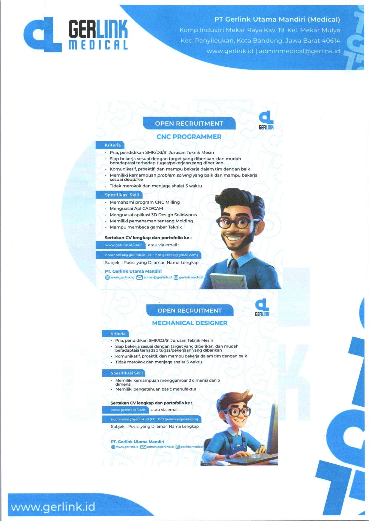 PT Gerlink Utama Mandiri merupakan perusahaan yang bergerak dalam bidang manufaktur alat kesehatan, saat ini sedang membukan lowongan kerja dengan posisi: