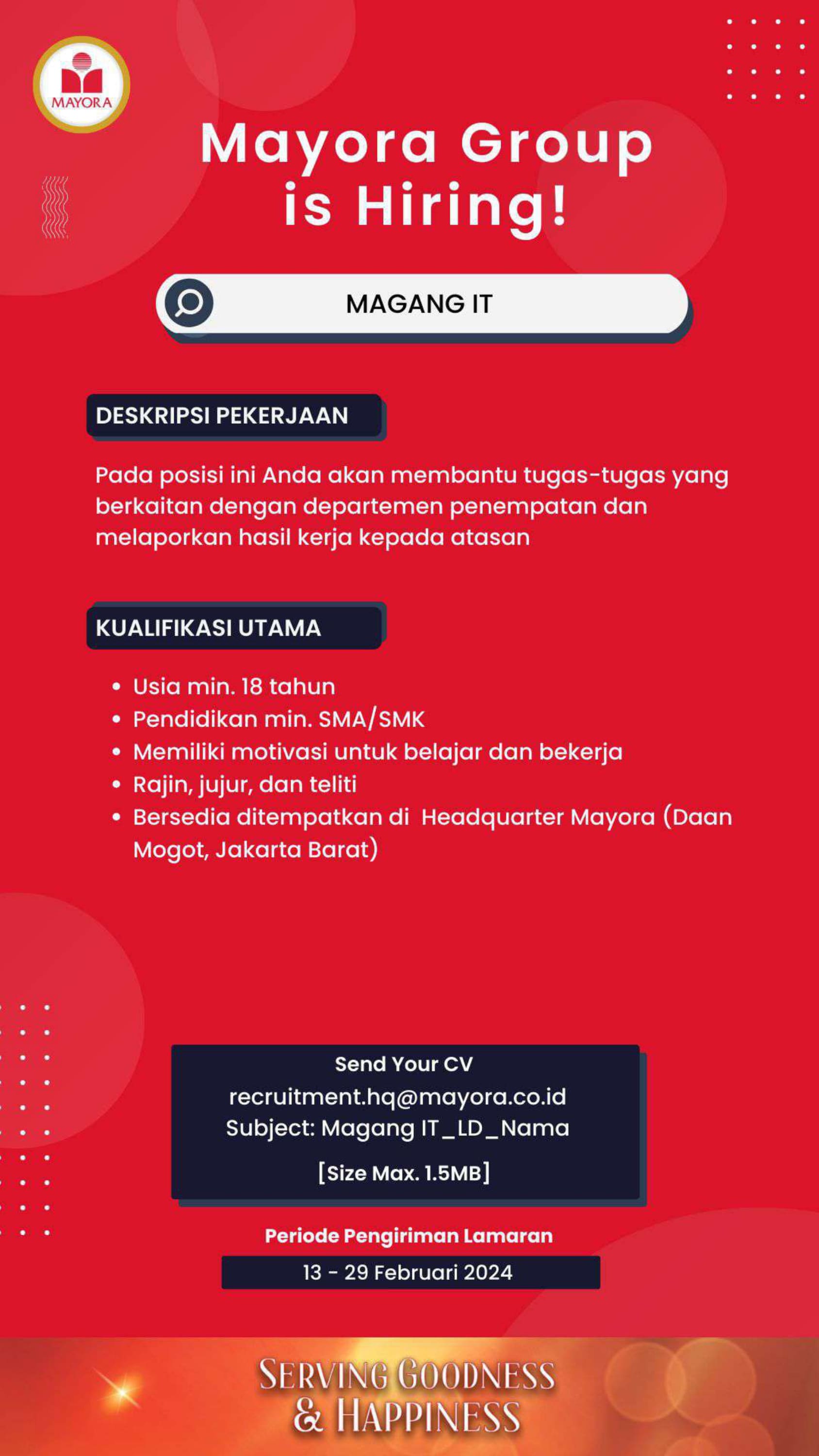 Note: Mayora Group tidak memungut biaya apapun dalam proses perekrutan, harap berhati-hati terhadap segala bentuk penipuan yang mengatasnamakan Mayora Group.