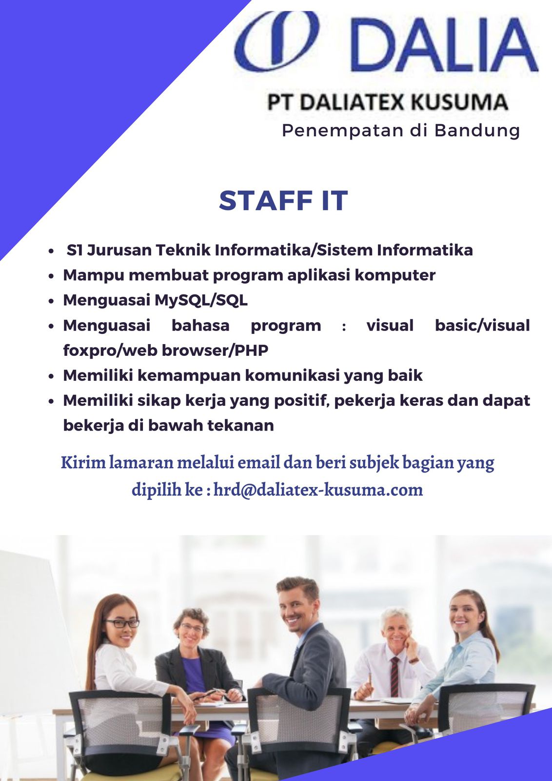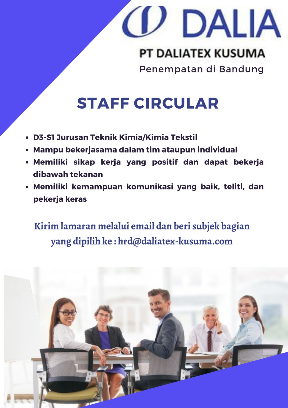 Didirikan tahun 1965, DALIATEX KUSUMA adalah salah satu produsen Tekstil terkemuka di Indonesia. Terletak di “kota bunga” Bandung yang eksotis, perusahaan ini mengambil inspirasi dari kekayaan budaya dan warisan kota untuk kain kreatifnya. saat ini sedang membuka lowongan kerja untuk beberapa posisi/bagian yang dibutuhkan :