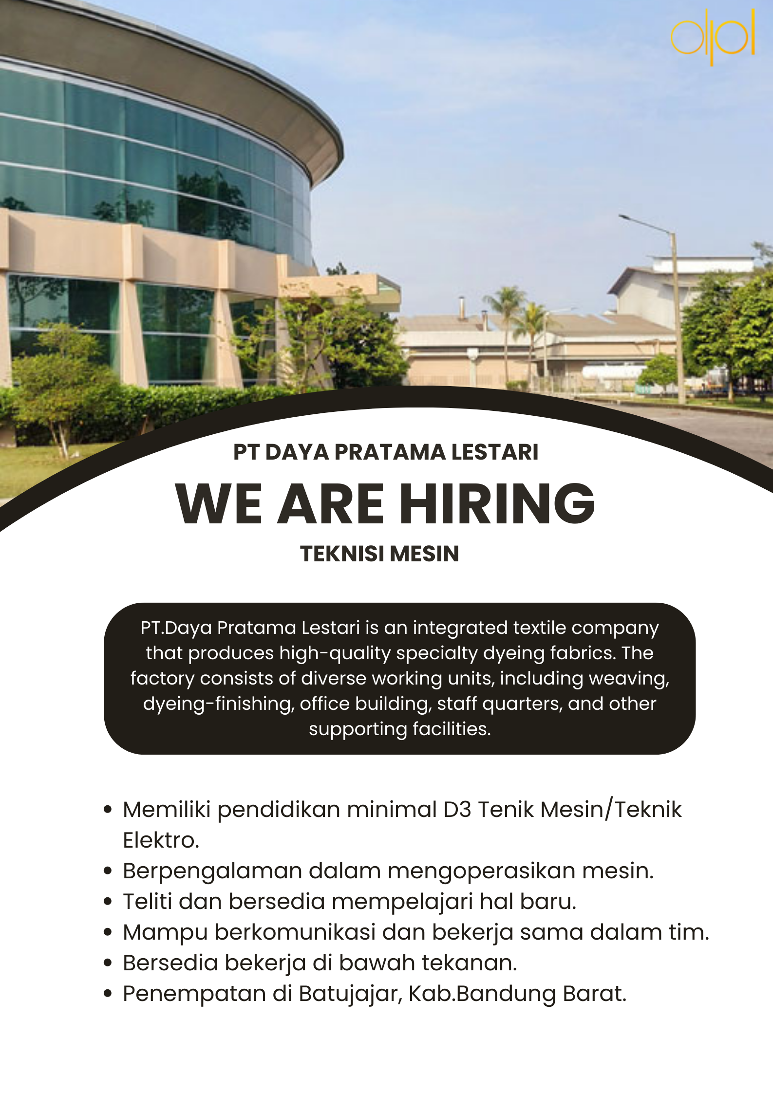 PT. Daya Pratama Lestari adalah perusahaan tekstil terpadu yang secara khusus memproduksi kain berwarna berkualitas tinggi. Terletak di kota industri modern Padalarang, Jawa Barat, Indonesia. Pabrik ini terdiri dari berbagai unit kerja, termasuk weaving, dyeing-finishing, gedung kantor, asrama, dan fasilitas pendukung lainnya. PT Daya Pratama Lestari berkomitmen untuk terus meningkatkan nilai dan kualitas perusahaan melalui produksi, pemasaran jaringang distribusi, dan layanan kami dengan dukungan dari sumber daya manusia yang berkualitas.