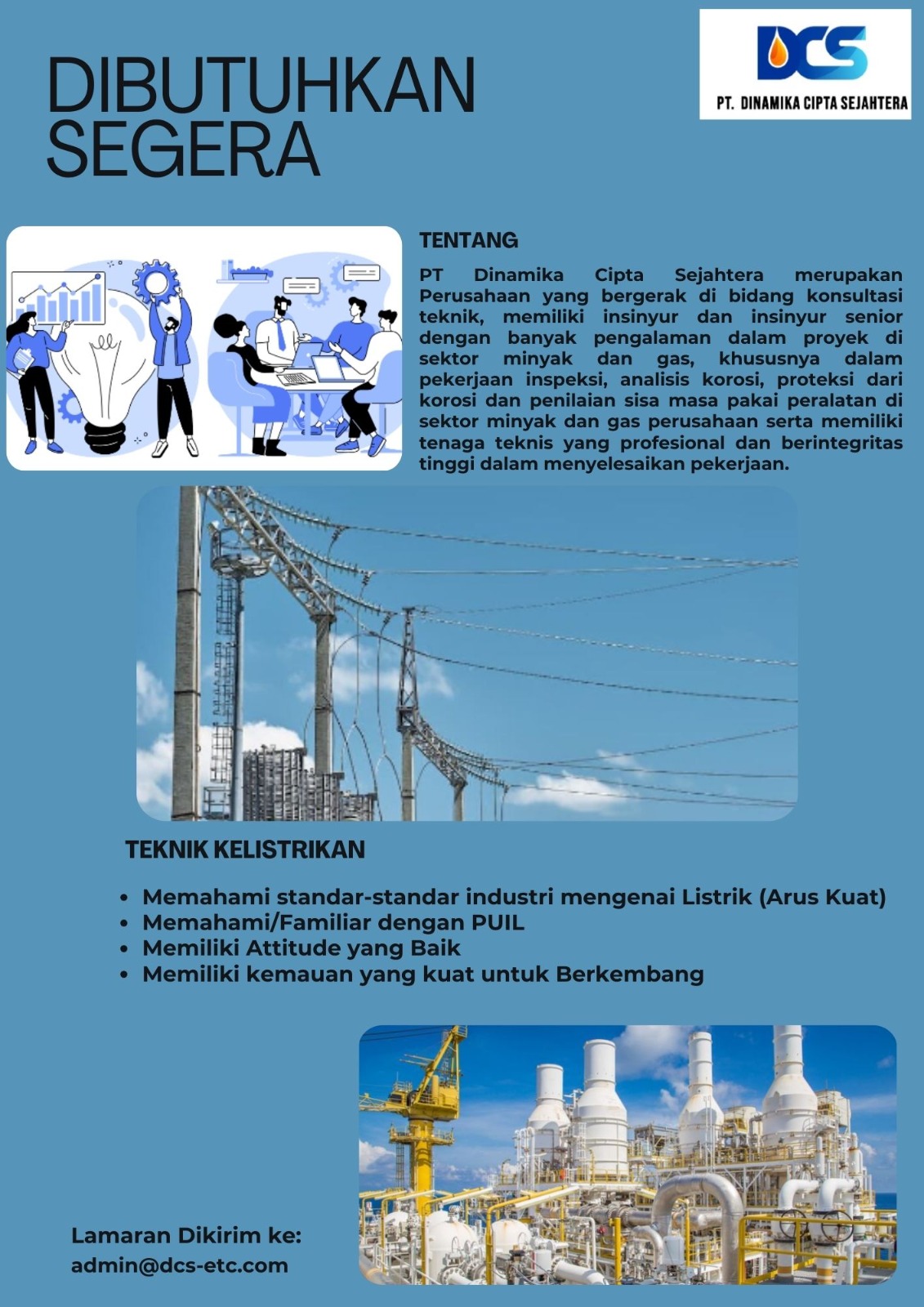 PT Dinamika Cipta Sejahtera merupakan perusahaan yang bergerak do bidang konsultasi teknik, memiliki insiyur dan insiyur senior dengan banyak pengalaman dalam proyek di sektor minyak dan gas khususnya dalam pekerjaan inspeksi, analisis korosi, proteksi dari korosi dan penilaian sisa masa pakai peralatan di sektor minyak dan gas perusahaan serta memiliki tenaga teknis yang profesional dan berintegritas tinggi dalam menyelesaikan pekerjaan