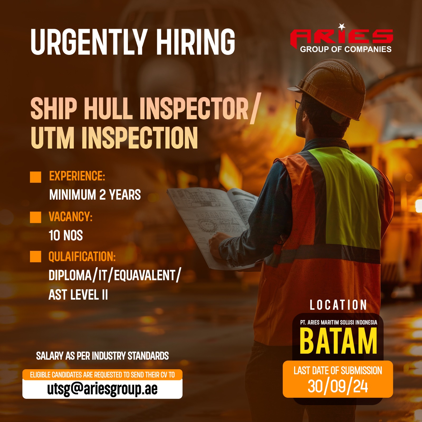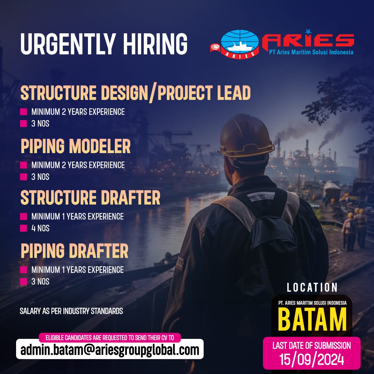 Send Resume and CV : admin.batam@ariesgroupglobal.com