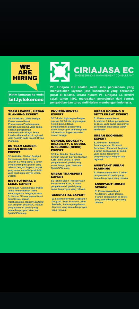 PT. Ciriajasa E.C. adalah perusahaan engineering dan management consultant yang saat ini sedang mengerjakan beberapa proyek di Ibu Kota Negara (IKN) Nusantara. Kami membuka kesempatan bekerja kepada masyarakat yang memiliki background yang sesuai dengan yang kami butuhkan, seperti: