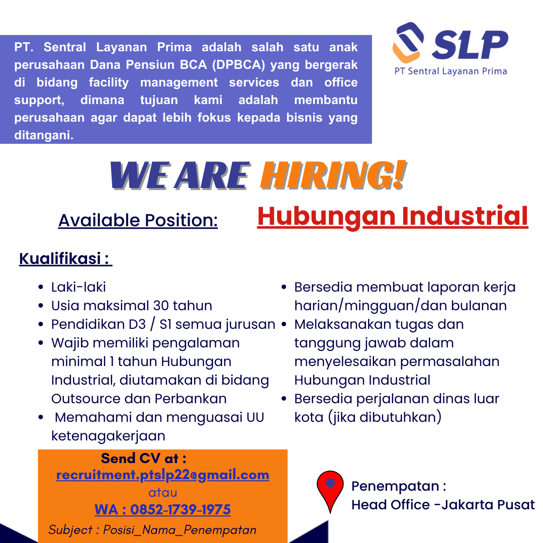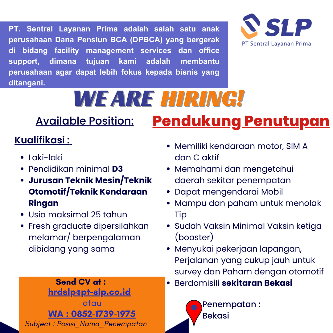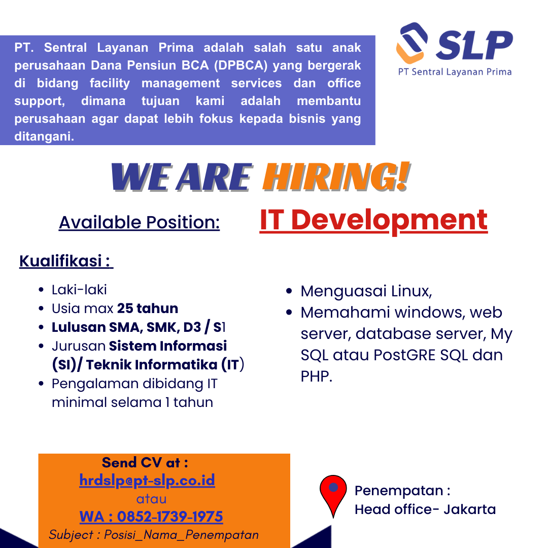 PT. Sentral Layanan Prima sedang membuka lowongan pekerjaan untuk posisi sebagai berikut :