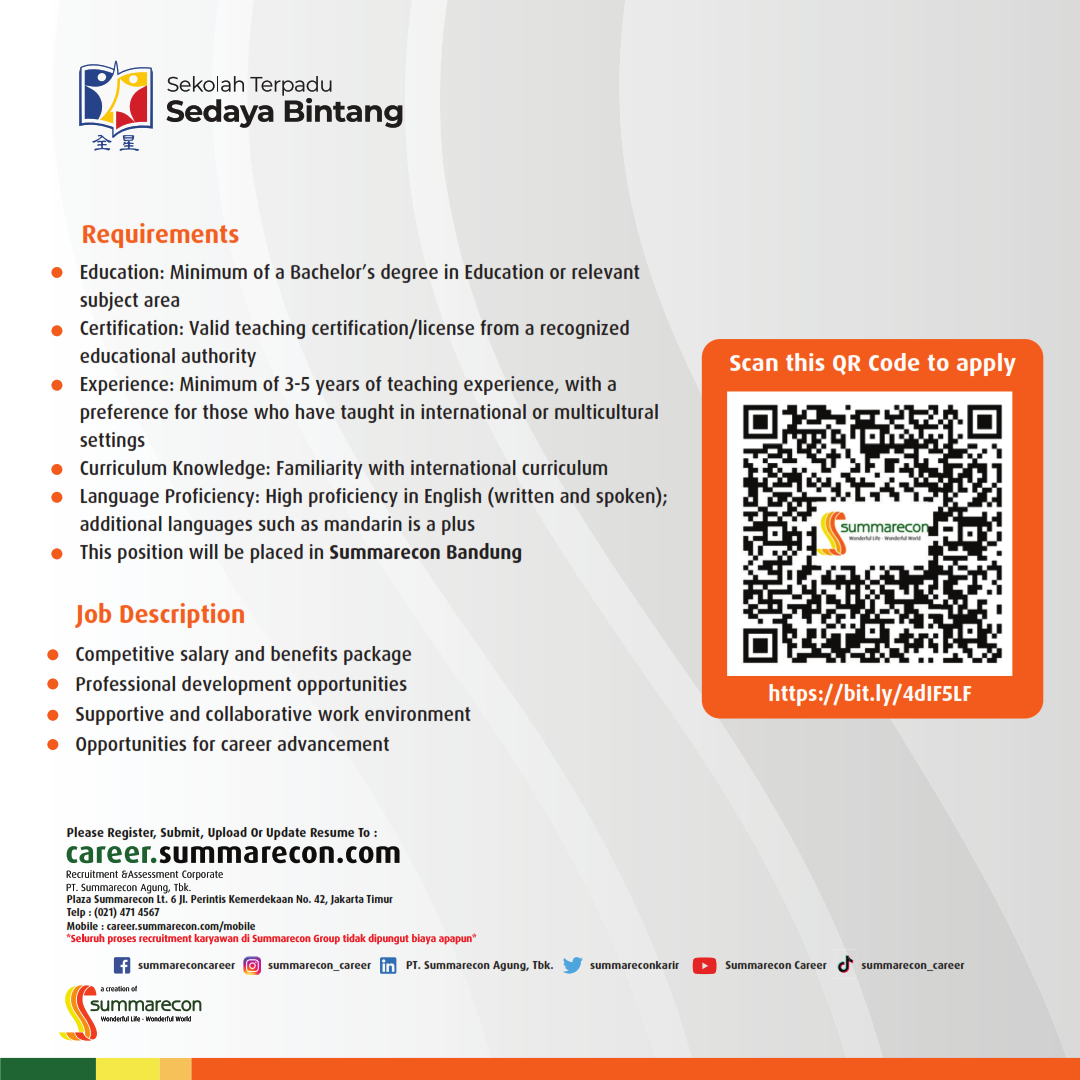 Sekolah Terpadu Sedaya Bintang dibawah naungan PT Summarecon Agung membuka lowongan pekerjaan untuk posisi sebagai berikut :