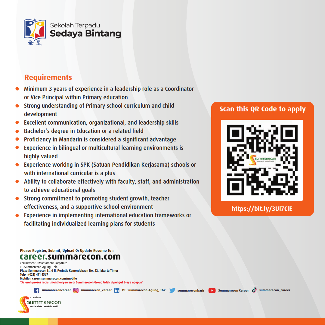 Sekolah Terpadu Sedaya Bintang dibawah naungan PT Summarecon Agung membuka lowongan pekerjaan untuk posisi sebagai berikut :