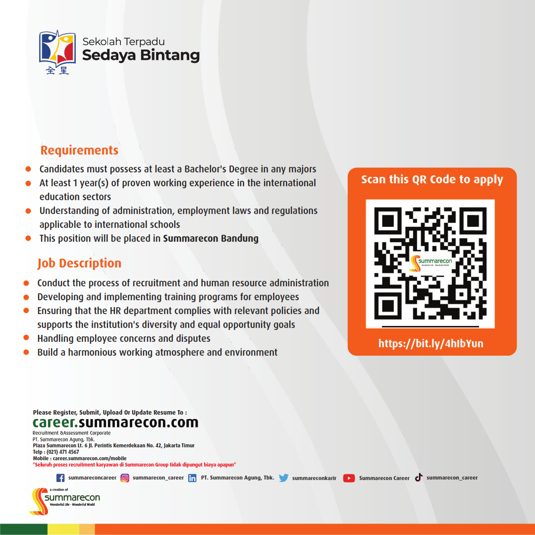 Sekolah Terpadu Sedaya Bintang dibawah naungan PT Summarecon Agung membuka lowongan pekerjaan untuk posisi sebagai berikut :