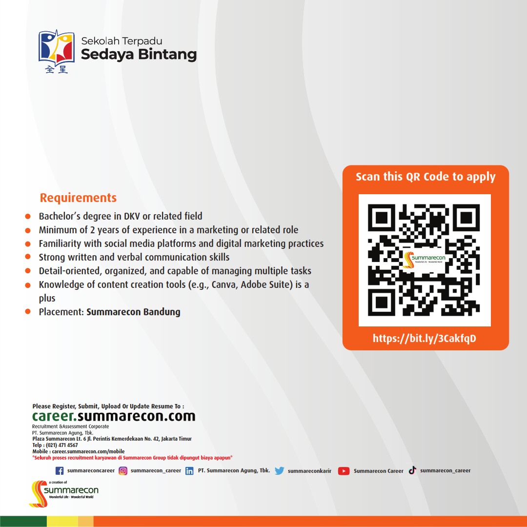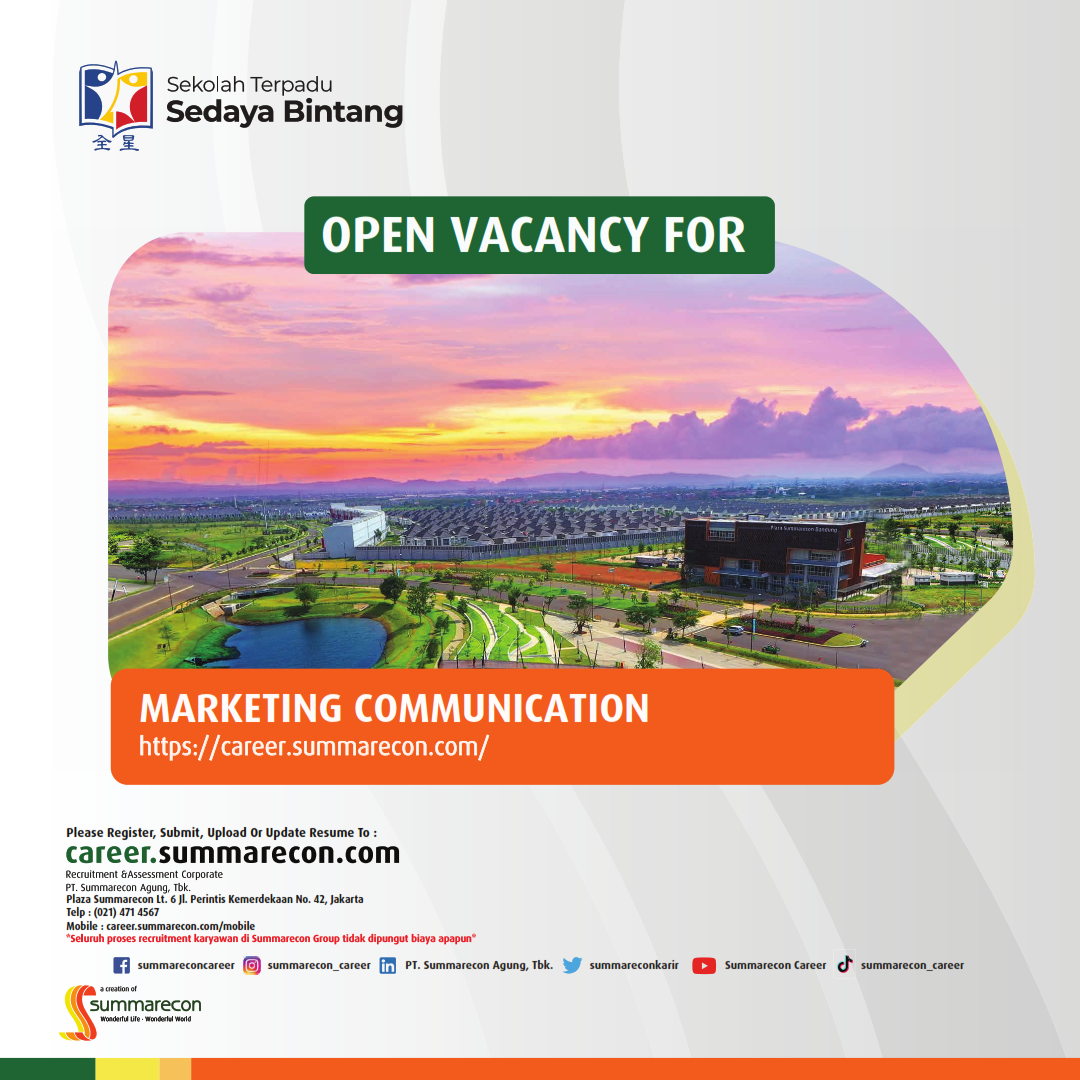 Sekolah Terpadu Sedaya Bintang dibawah naungan PT Summarecon Agung membuka lowongan pekerjaan untuk posisi sebagai berikut :