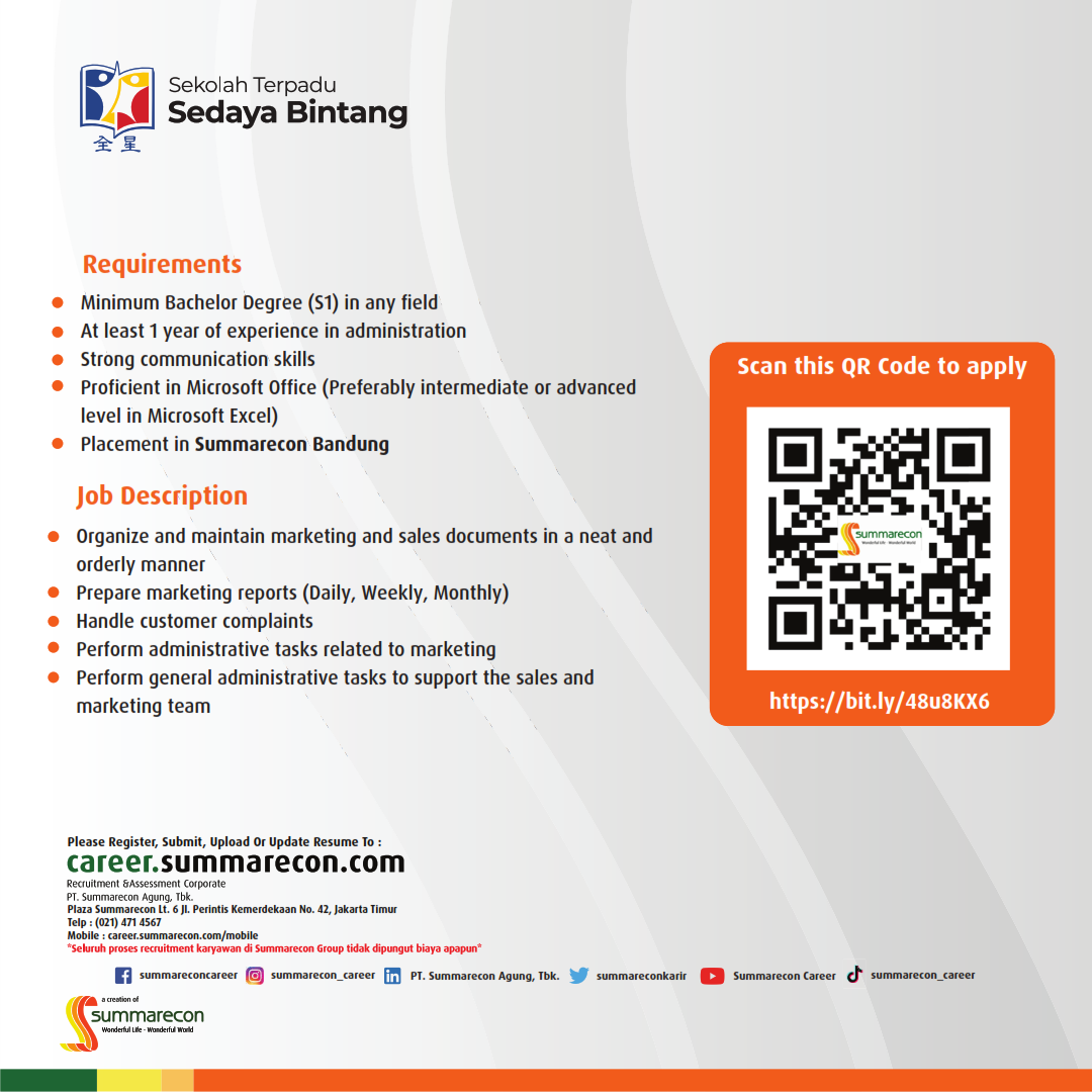 Sekolah Terpadu Sedaya Bintang dibawah naungan PT Summarecon Agung membuka lowongan pekerjaan untuk posisi sebagai berikut :