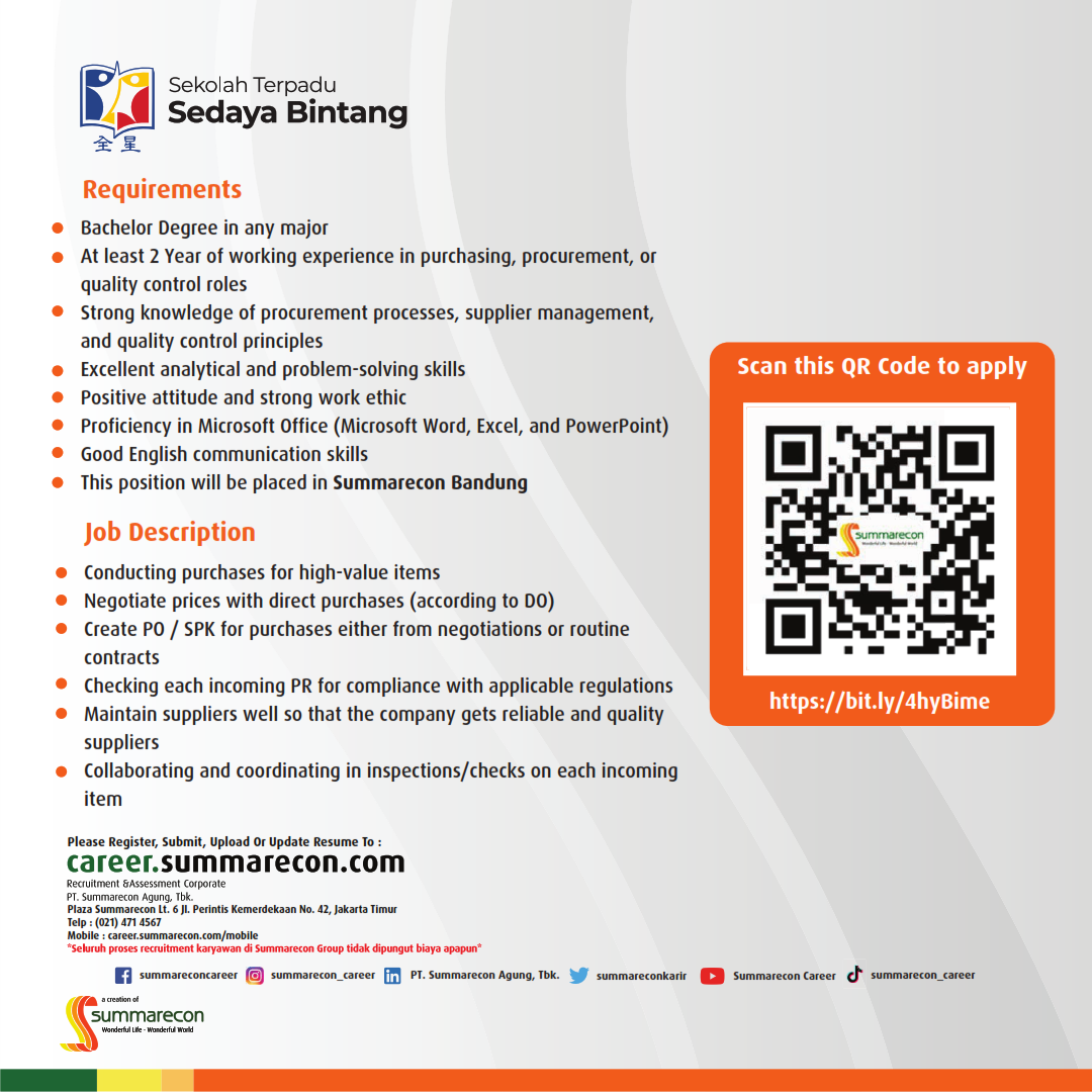 Sekolah Terpadu Sedaya Bintang dibawah naungan PT Summarecon Agung membuka lowongan pekerjaan untuk posisi sebagai berikut :