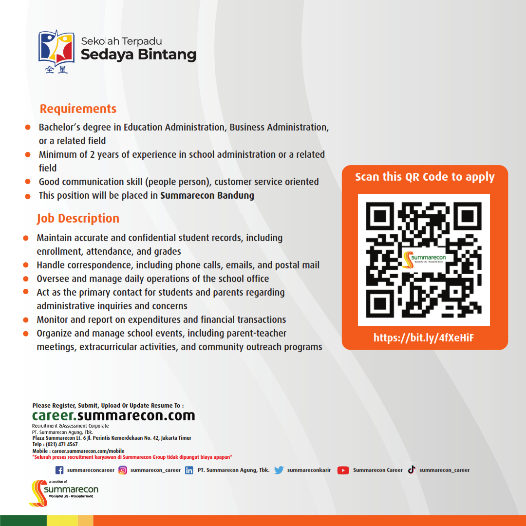 Sekolah Terpadu Sedaya Bintang dibawah naungan PT Summarecon Agung membuka lowongan pekerjaan untuk posisi sebagai berikut :