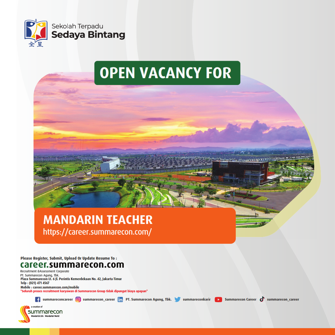 Sekolah Terpadu Sedaya Bintang dibawah naungan PT Summarecon Agung membuka lowongan pekerjaan untuk posisi sebagai berikut :