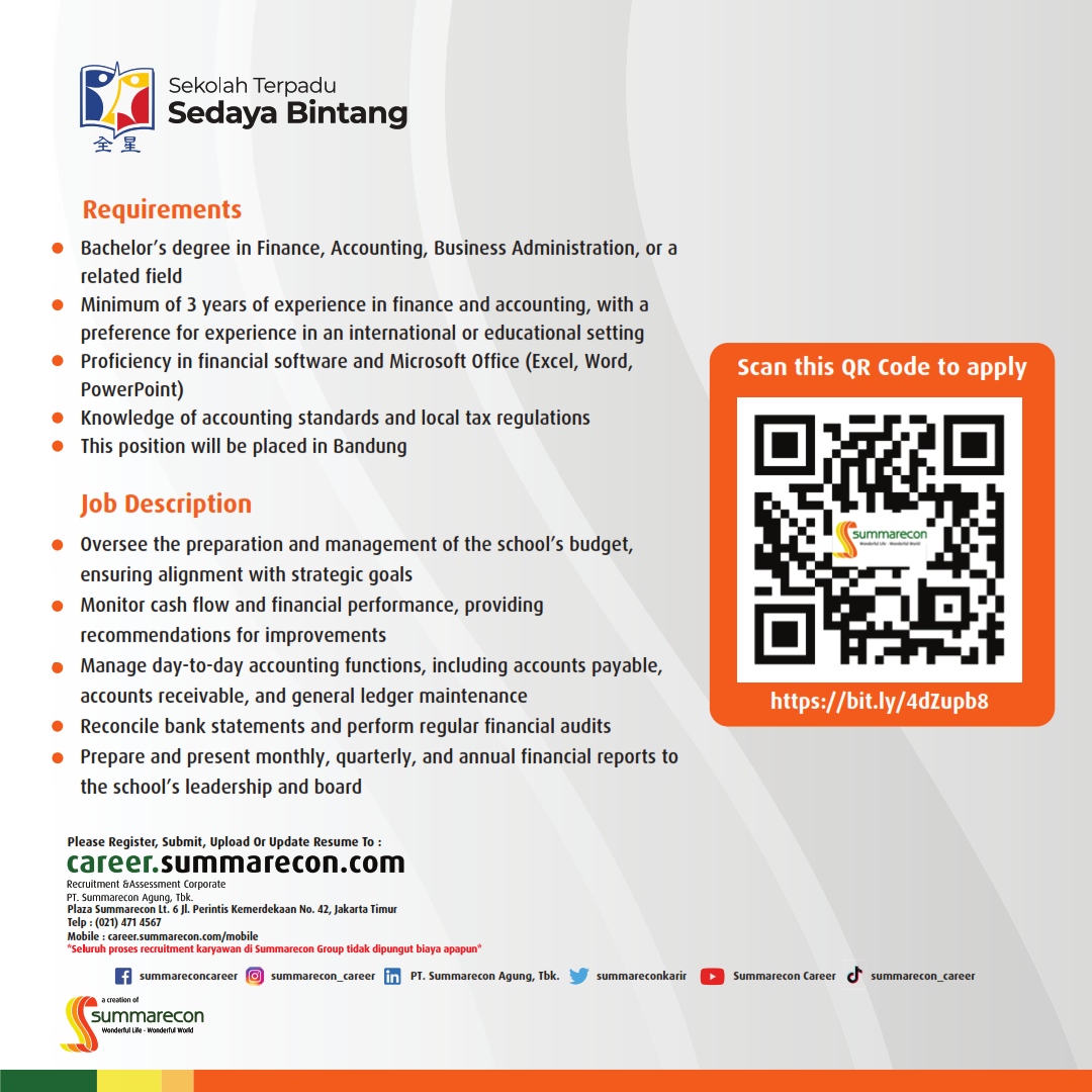 Sekolah Terpadu Sedaya Bintang dibawah naungan PT Summarecon Agung membuka lowongan pekerjaan untuk posisi sebagai berikut :