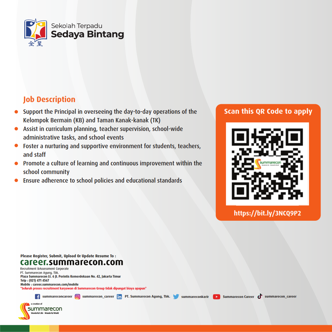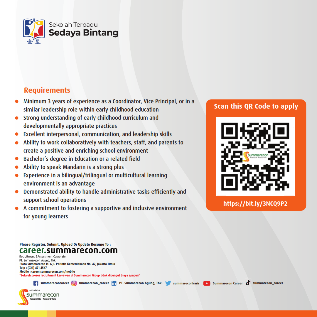 Sekolah Terpadu Sedaya Bintang dibawah naungan PT Summarecon Agung membuka lowongan pekerjaan untuk posisi sebagai berikut :