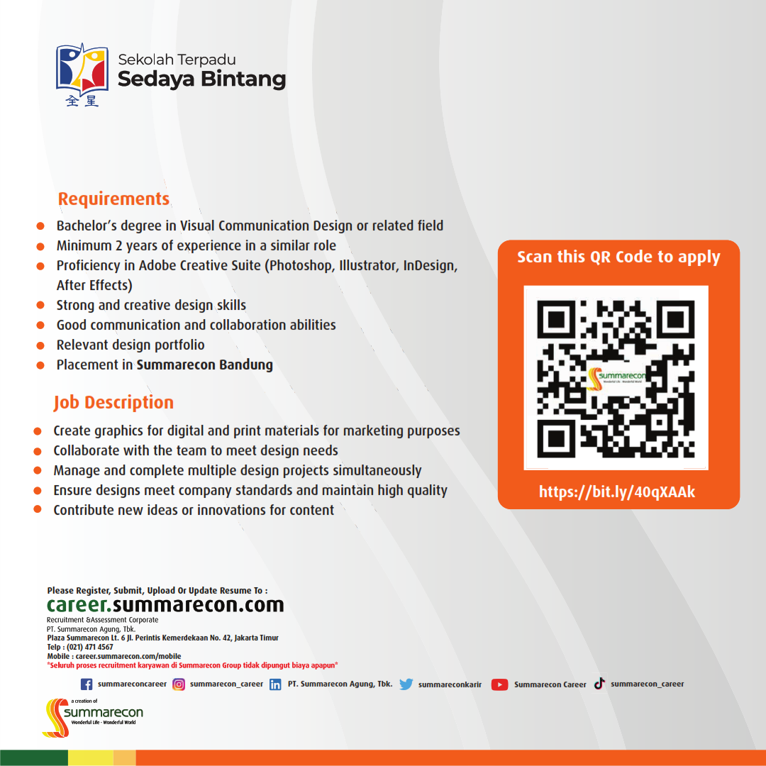 Sekolah Terpadu Sedaya Bintang dibawah naungan PT Summarecon Agung membuka lowongan pekerjaan untuk posisi sebagai berikut :