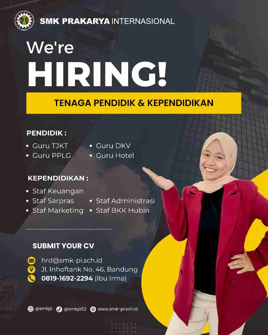 SMK Prakarya Internasional [SMK PI] Yayasan Pendidikan Teknologi Prakarya Internasional [YPTPI] membuka lowongan pekerjaan untuk memduduki posis sebagai Tenaga Pendidikan dan Tenaga Kependidikan