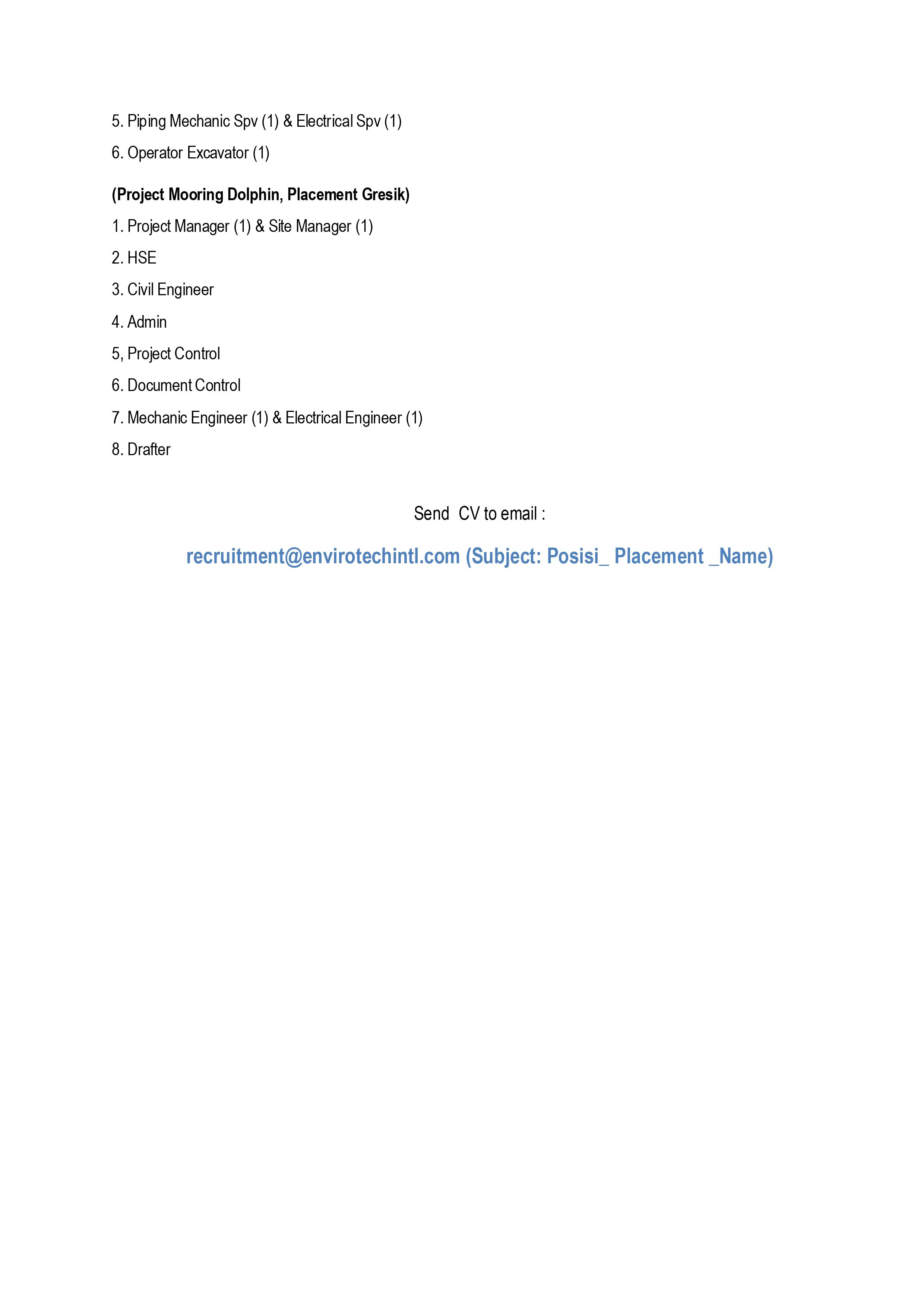 recruitment@envirotechintl.com (Subject: Posisi_ Placement _Name)