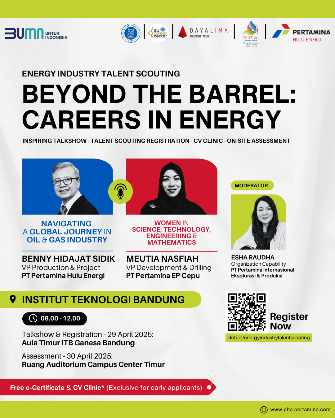 Talkshow Eksklusif ENERGY INDUSTRY TALENT SCOUTING: BEYOND THE BARREL: CAREERS IN ENERGY Gali kesempatan karir-mu di dunia energi dan pelajari strategi terbaik Read More