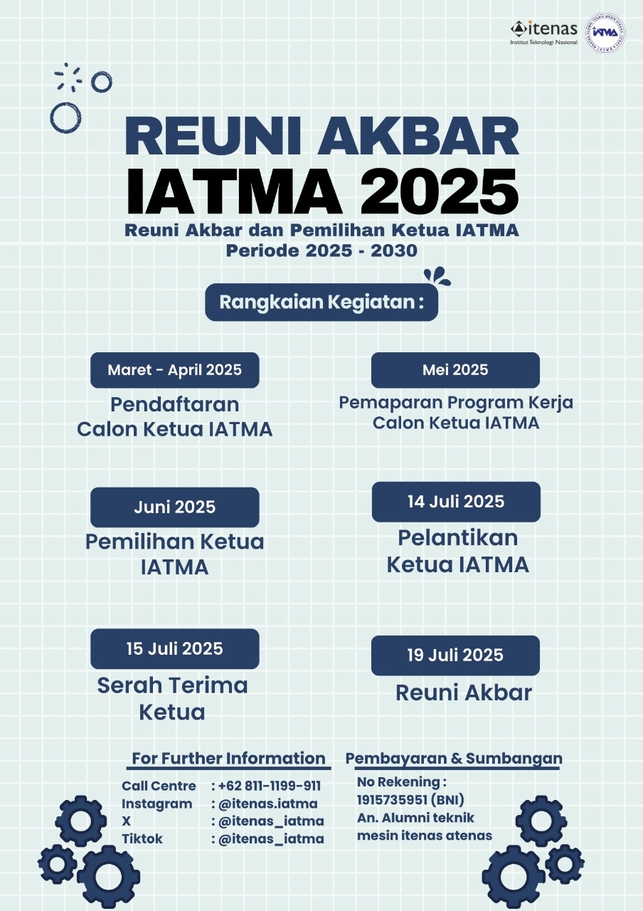 REUNI AKBAR IATMA 2025 Reuni Akbar dan Pemilihan Ketua IATMA (Ikatan Alumni Teknik Mesin Atenas - Itenas) Read More