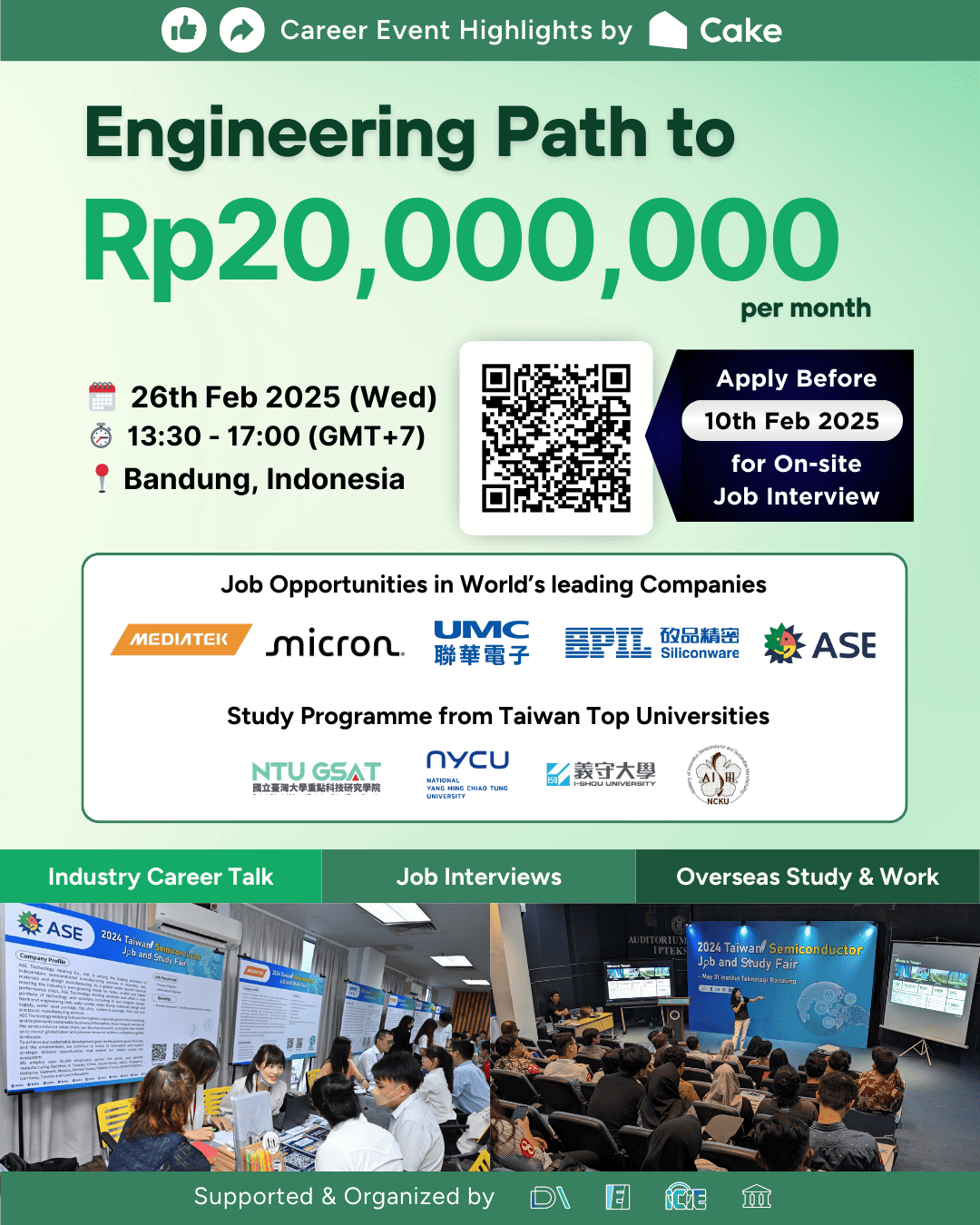 Semiconductor Job & Study Fair Pemerintah Taiwan akan mengadakan Semiconductor Job & Study Fair. Pendaftaran Online Dibuka: Sekarang – 16 Februari 2025 Read More