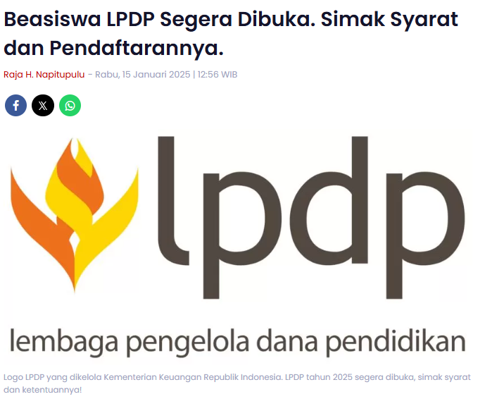 Beasiswa LPDP Pendaftaran beasiswa Lembaga Pengelola Dana Pendidikan (LPDP) tahun 2025 tahap 1 resmi dibuka pada Jumat (17/01/2025). Melalui akun Instagram resminya, LPDP m Read More