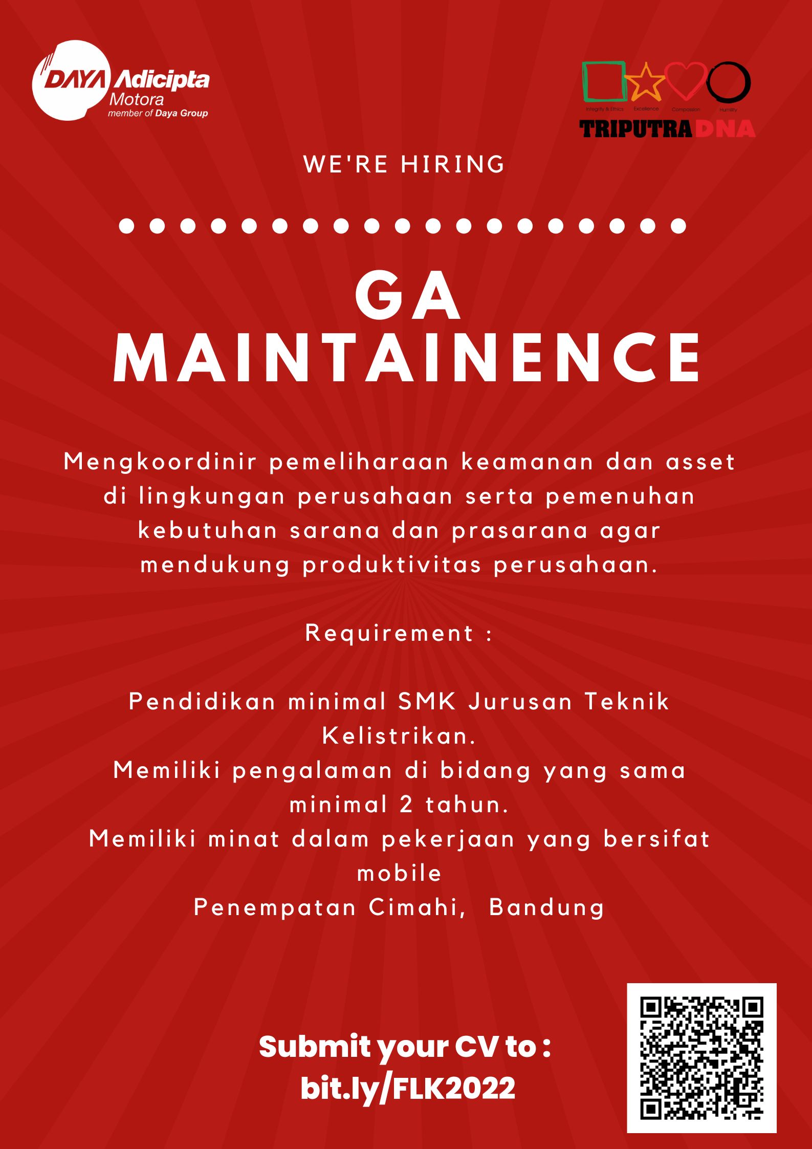 - Memiliki pengalaman di bidang yang sama minimal 2 tahun.