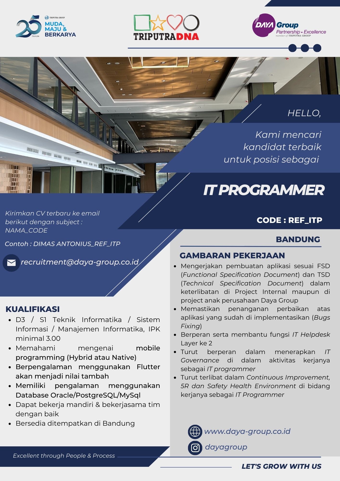 - Memiliki pengalaman menggunakan database Oracle, My Sql, PostgreSQL