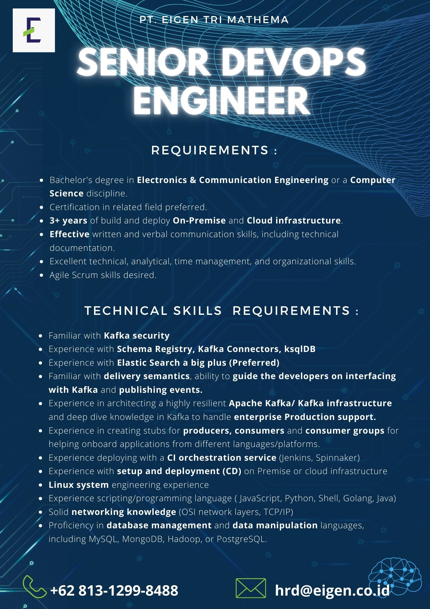 Eigen adalah IT-services and software solutions provider, dengan pengalaman lebih dari 10 tahun, berfokus pada konsultasi IT dan layanan rekayasa perangkat lunak. Kami memberi kesempatan untuk bergabung dengan kebutuhan posisi saat ini Senior DevOps Engineer.