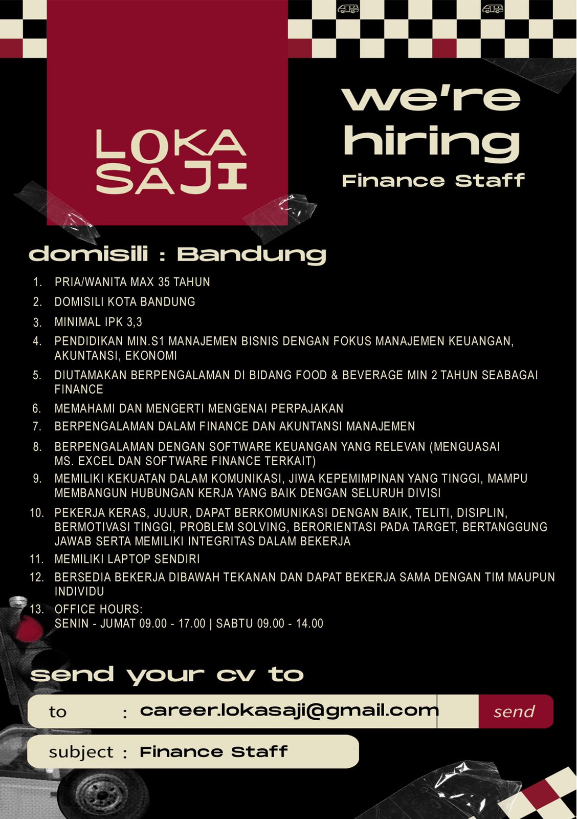 5. Diutamakan berpengalaman di bidang Food & Beverage minimal 2 tahun sebagai finance