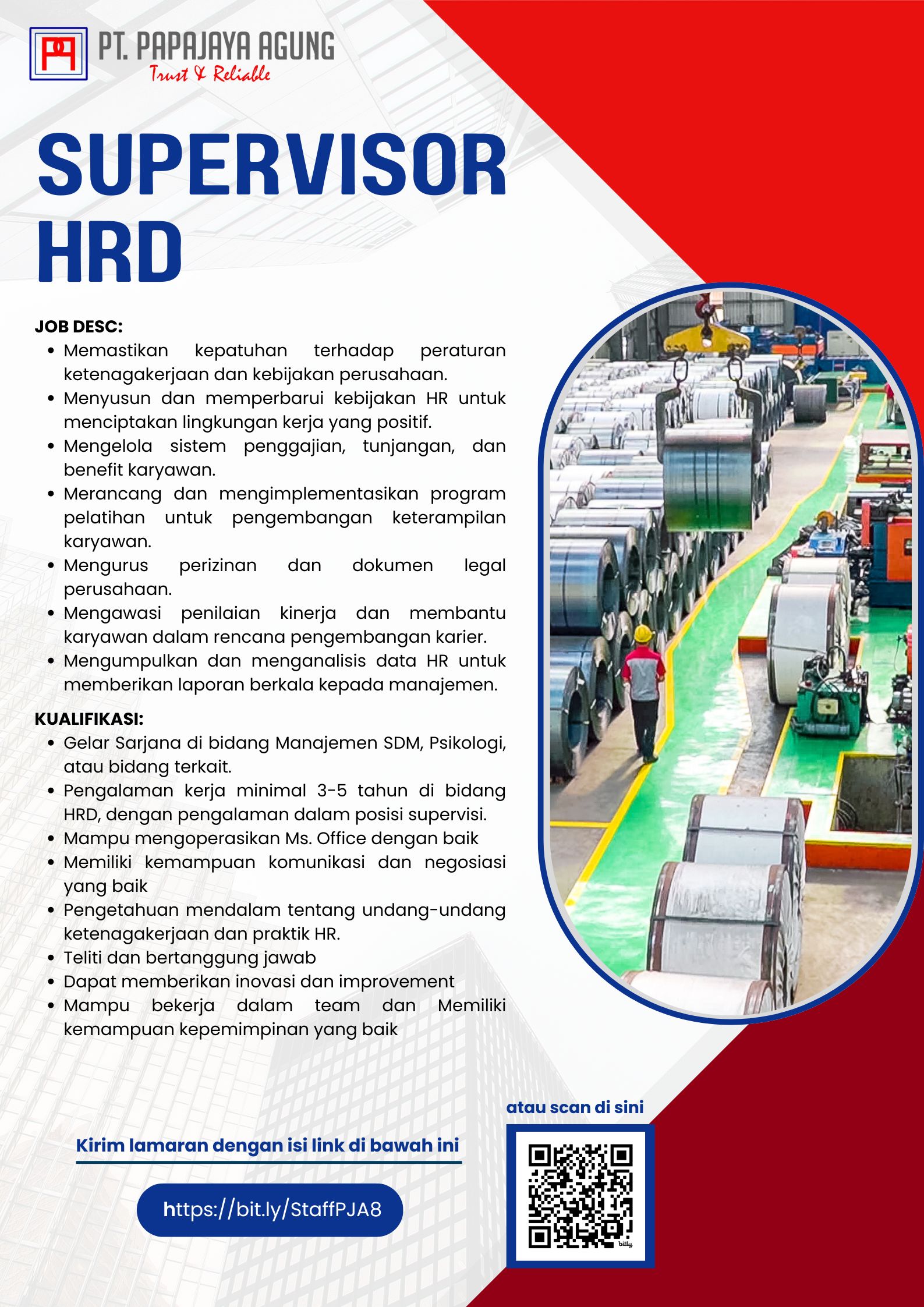 - Pengalaman kerja minimal 3-5 tahun di bidang HRD, dengan pengalaman dalam posisi supervisi.