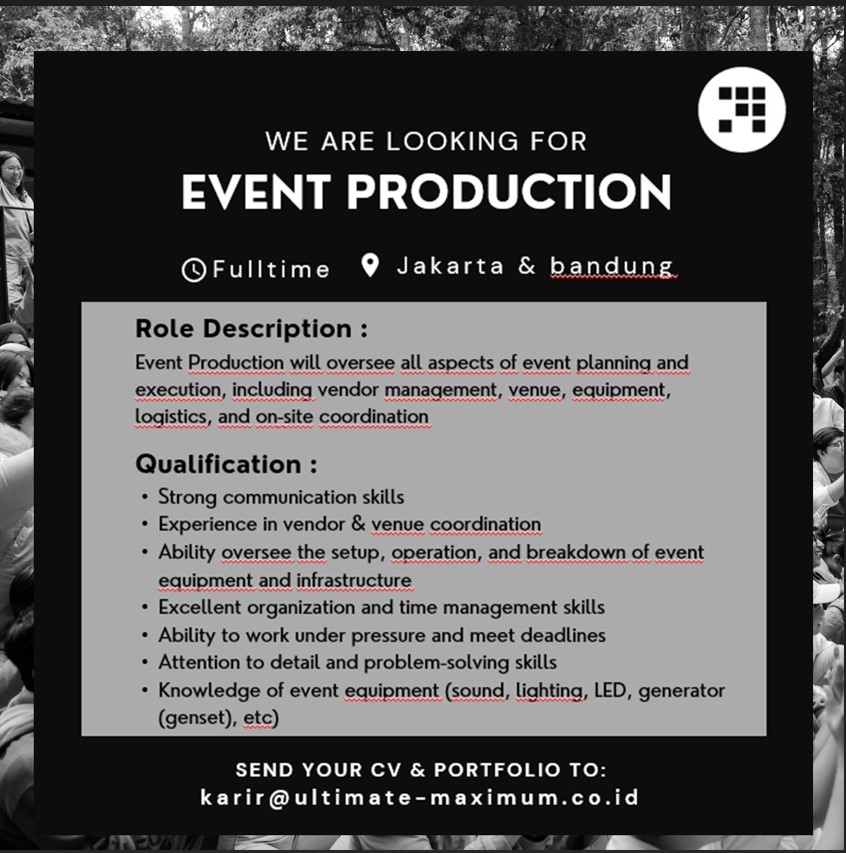 We only process applicants with CV and portfolio links. If you interest you can send your latest CV, WA contact number & portfolio to our email : karir@ultimate-maximum.co.id with subject : position- Linked in- your completed name. For further information you can visit our social media instagram and you tube @MaximumTheUltimate.
