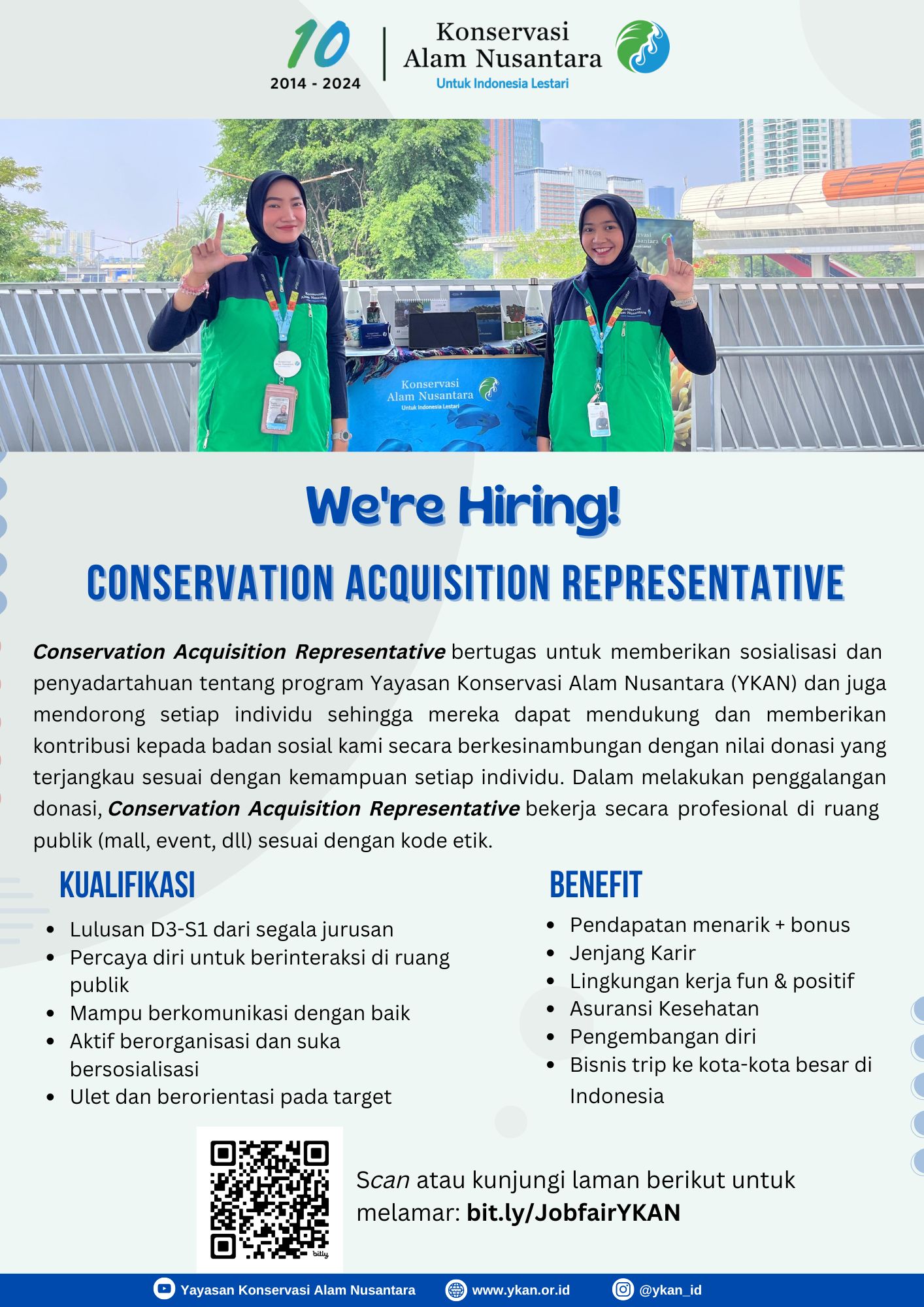 Yayasan Konservasi Alam Nusantara (YKAN) mencari Conservation Acquisition Representative (Fundraiser) yang bersemangat untuk menjadi garda terdepan dalam meningkatkan kesadaran tentang konservasi alam di masyarakat. Kesempatan ini terbuka bagi siapa pun yang ingin berkontribusi pada pelestarian lingkungan. Sebagai Conservation Acquisition Representative, tugas utama meliputi memberikan informasi langsung kepada masyarakat mengenai program konservasi kami dan mengajak mereka untuk berdonasi secara berkelanjutan. Peran ini akan dilakukan di tempat-tempat publik dengan profesional dan sesuai dengan kode etik yang berlaku.