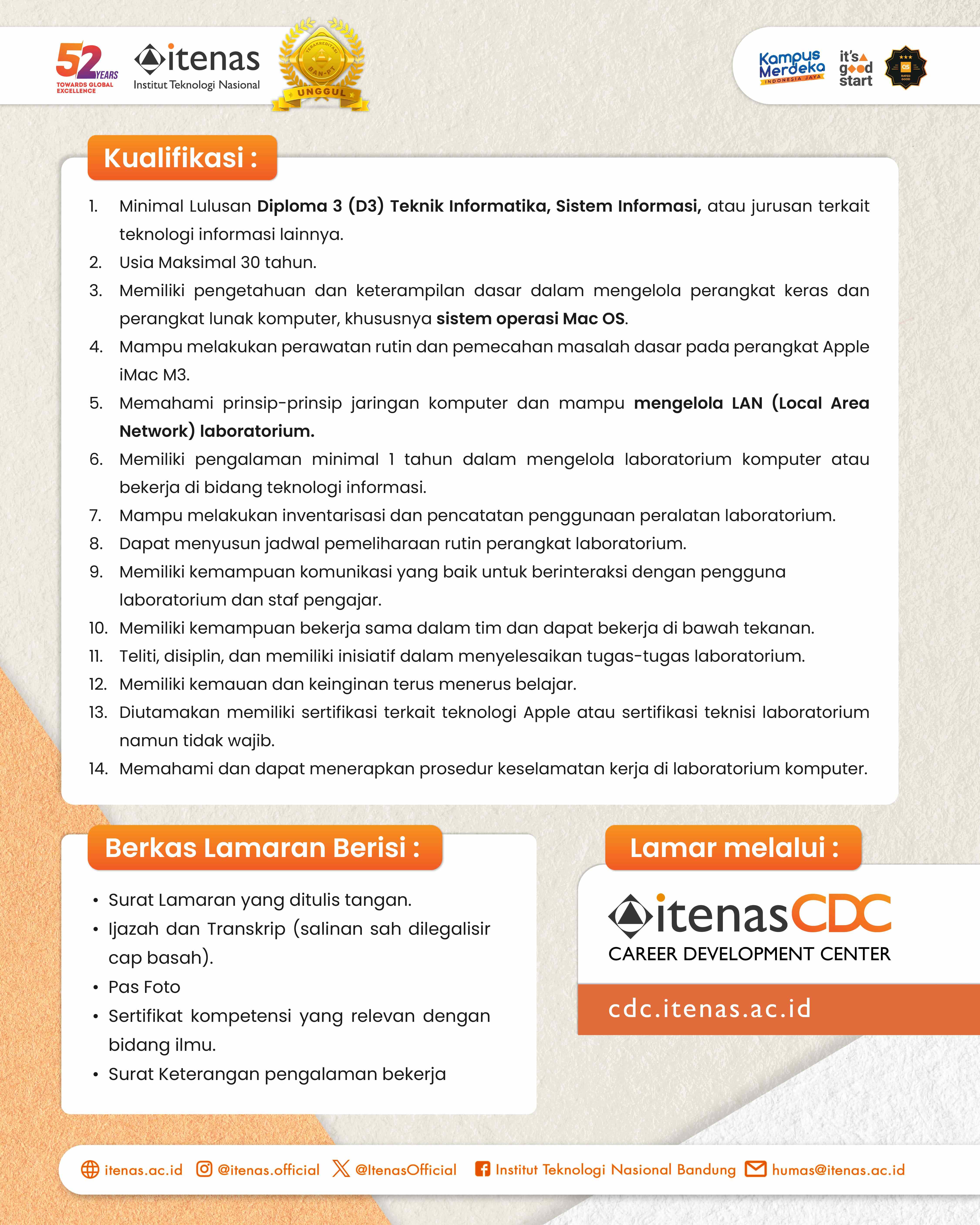 Info lebih lanjut dapat menghubungi kepegawaian@itenas.ac.id atau menghubungi melalui hotline (022) 7272215