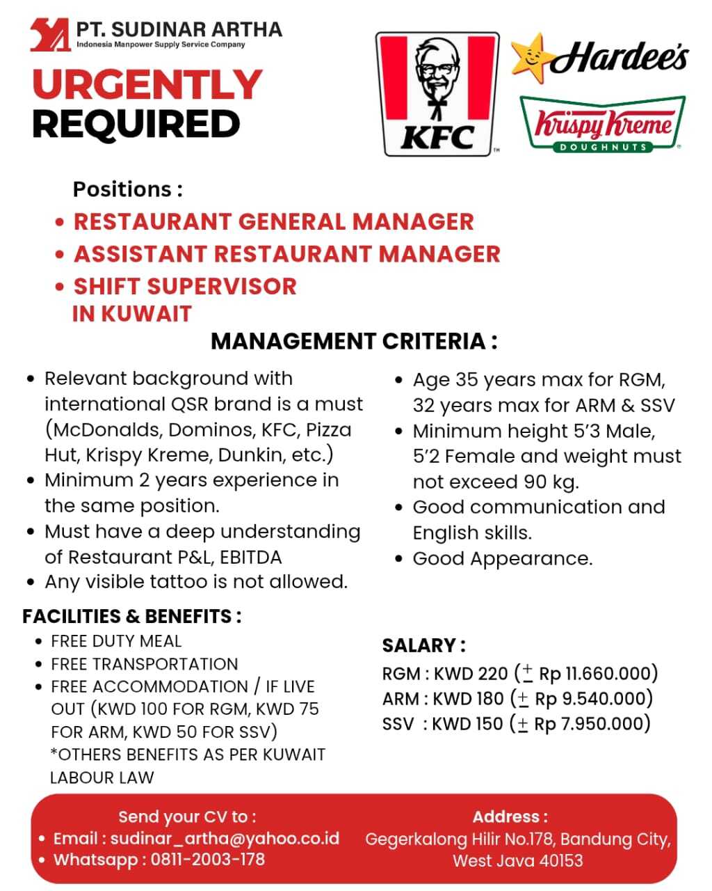 Restaurant General Manager penempatan di QSR Kuwait ( KFC, Hardee's, Krispy Kreme )