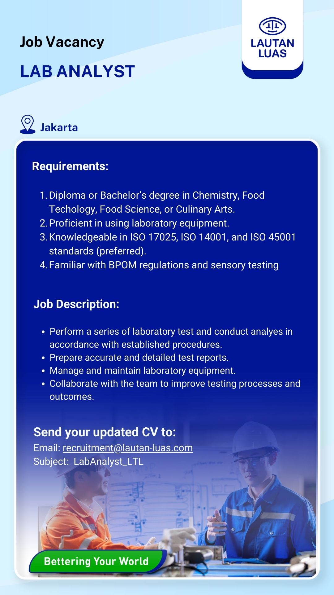 Send your update CV to : recruitment@lautan-luas.com