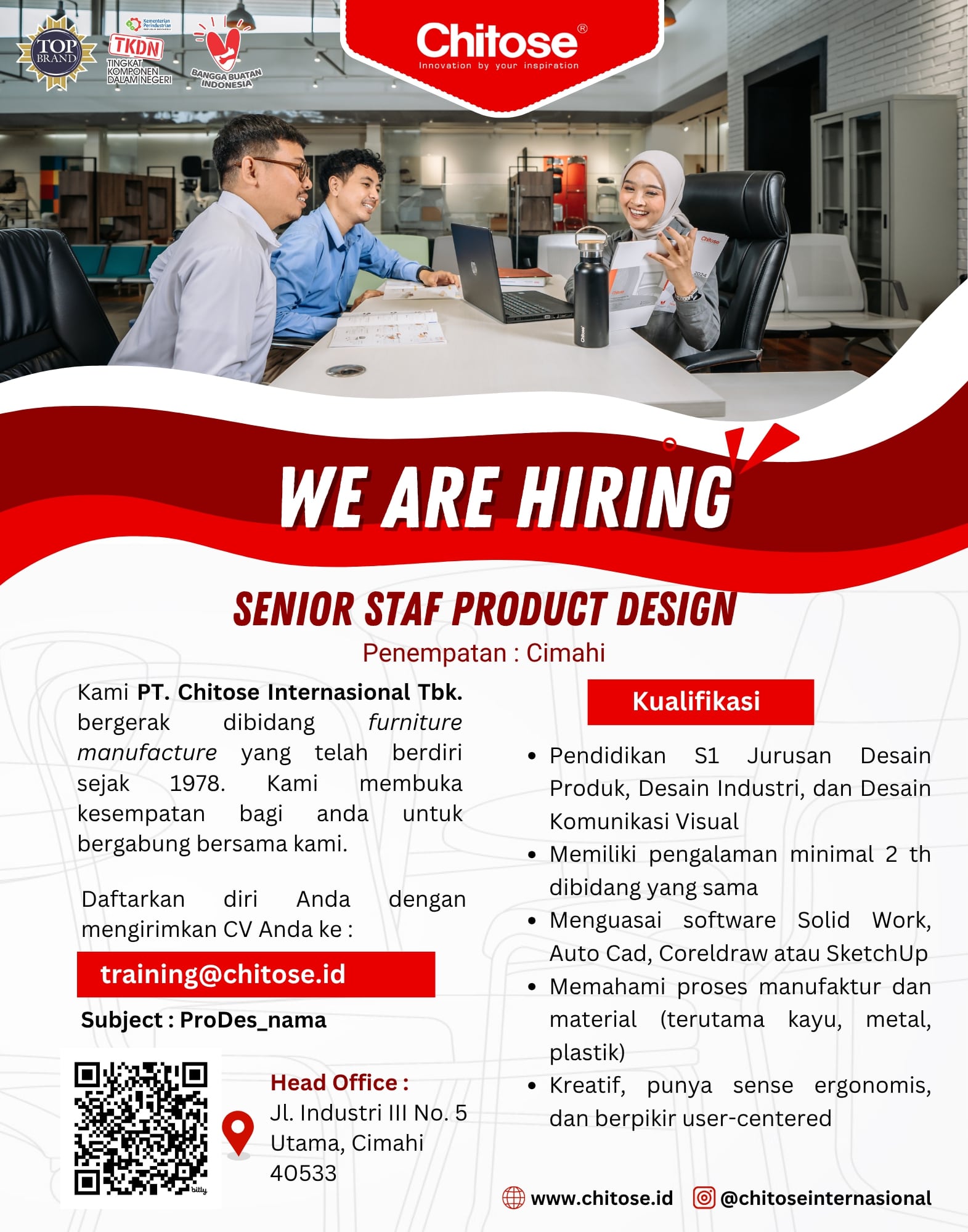 Kami membuka kesempatan bagi talenta kreatif untuk bergabung sebagai Staff Product Design. Posisi ini akan berperan penting dalam proses perancangan dan pengembangan produk perusahaan agar sesuai dengan kebutuhan pasar dan standar kualitas.