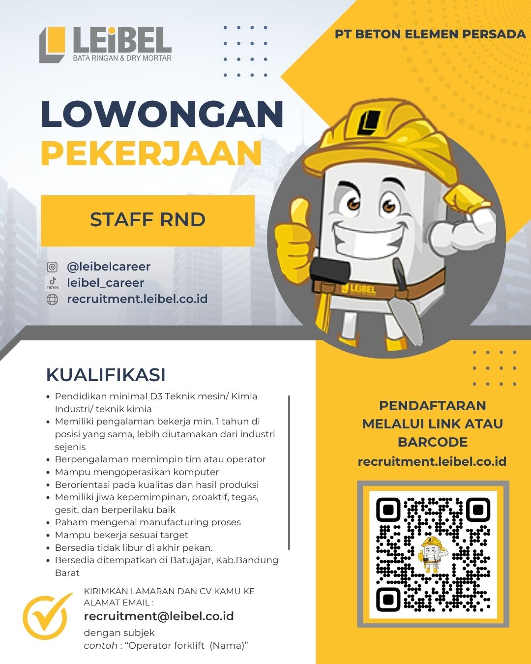 - Pendidikan minimal D3 Teknik mesin/ Kimia Industri/ teknik kimia