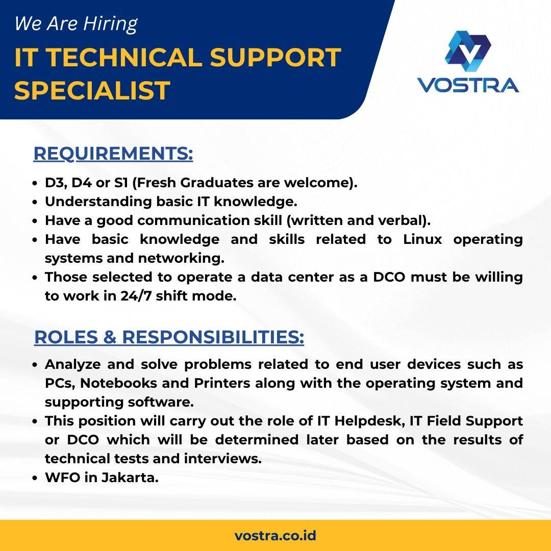 - This position will carry out the role of IT Helpdesk, IT Field Support or DCO which will be determined later based on the results of technical tests and interviews.
