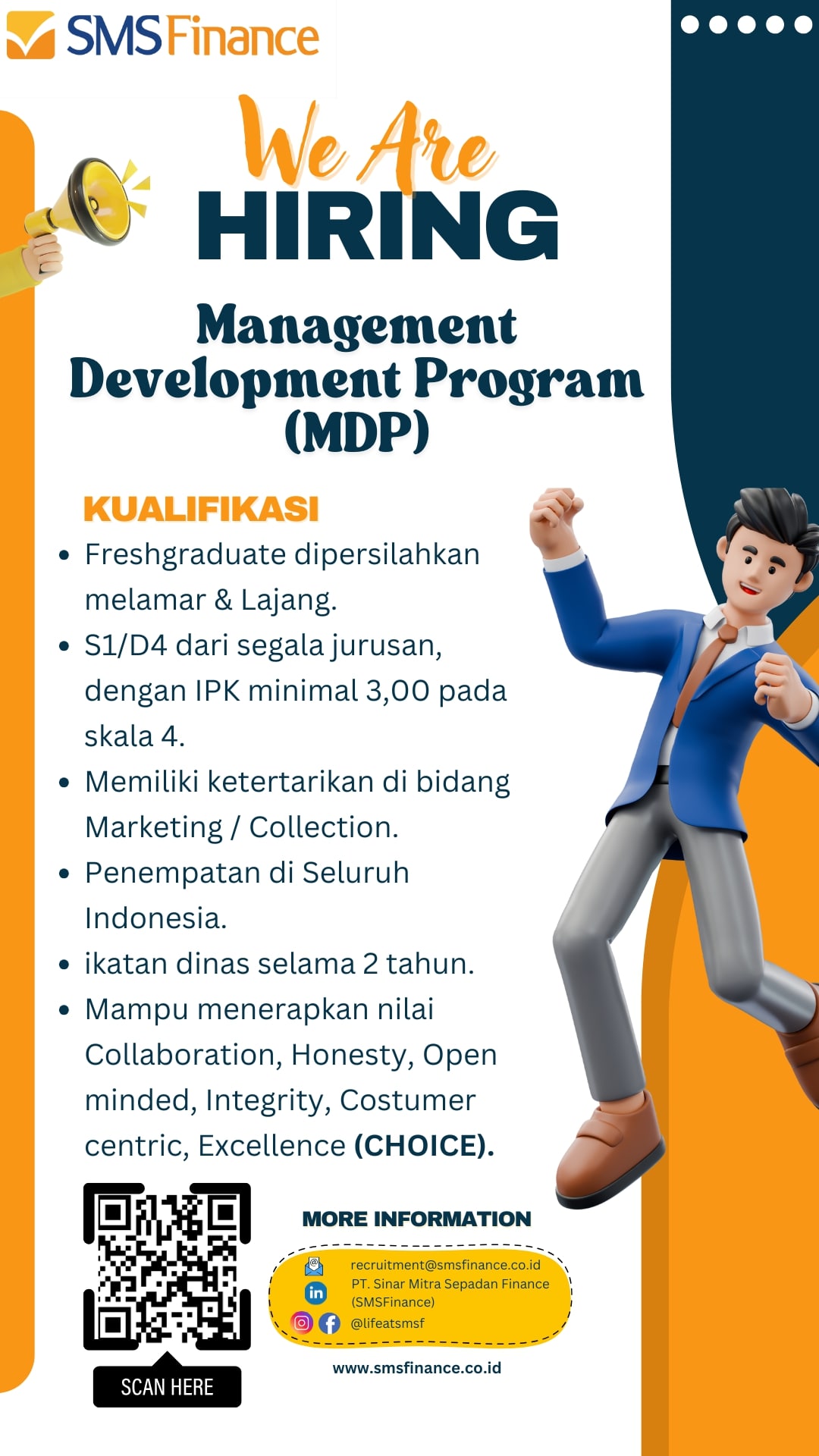 Management Development Program (MDP) merupakan program percepatan karir yang dipersiapkan oleh perusahaan untuk calon pemimpin masa depan suatu perusahaan. Program ini dikhususkan untuk para Fresh Graduate yang ingin mengembangkan potensi kepemimpinan dalam dirinya.