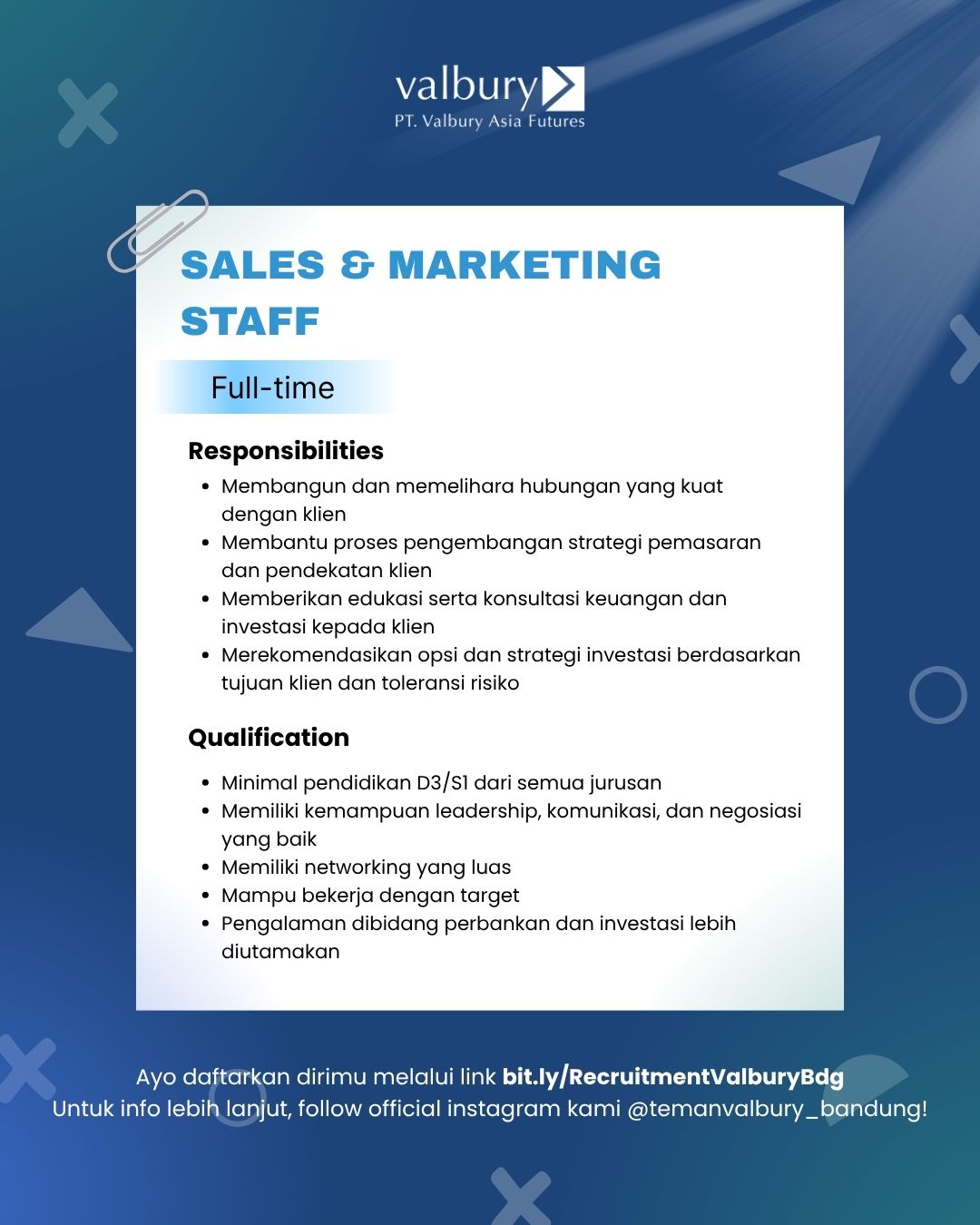 Valbury Asia Futures membuka kesempatan bagi kamu yang bersemangat di dunia penjualan dan finansial!