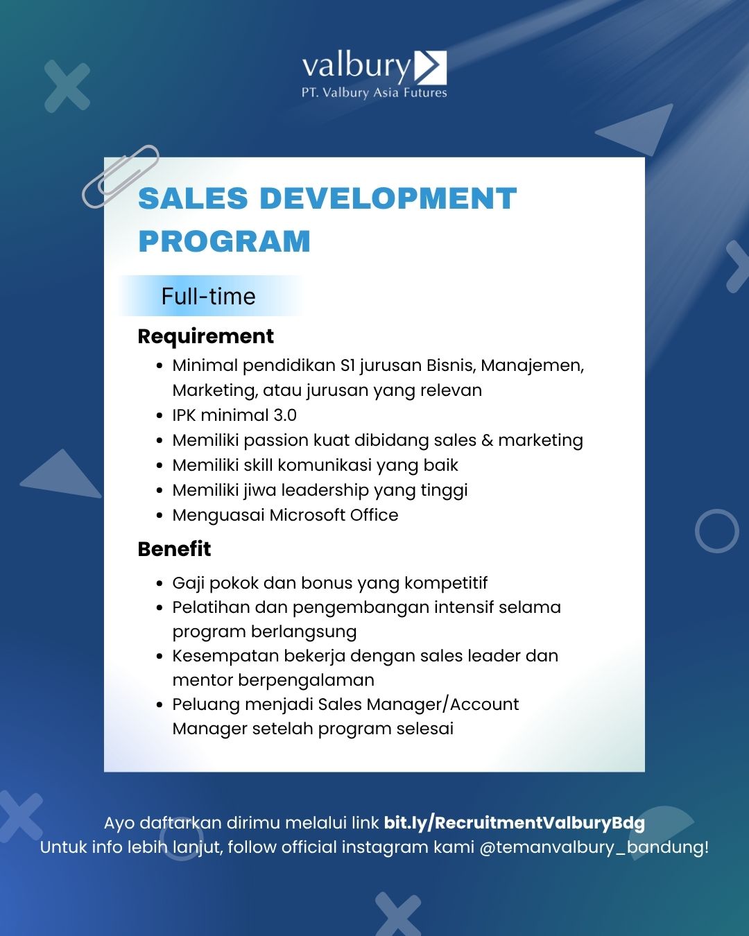 Valbury Asia Futures membuka kesempatan bagi kamu yang ambisius, komunikatif, dan tertarik berkarier di dunia sales dan financial market.