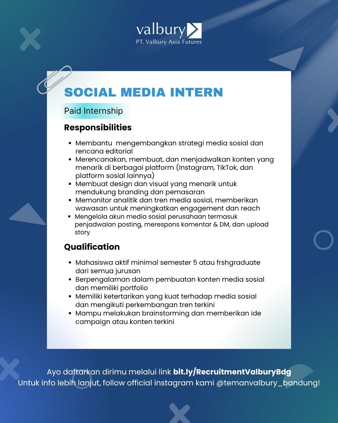 Valbury Asia Futures membuka kesempatan bagi mahasiswa atau fresh graduate yang kreatif dan aktif di media sosial untuk bergabung sebagai Social Media Intern.