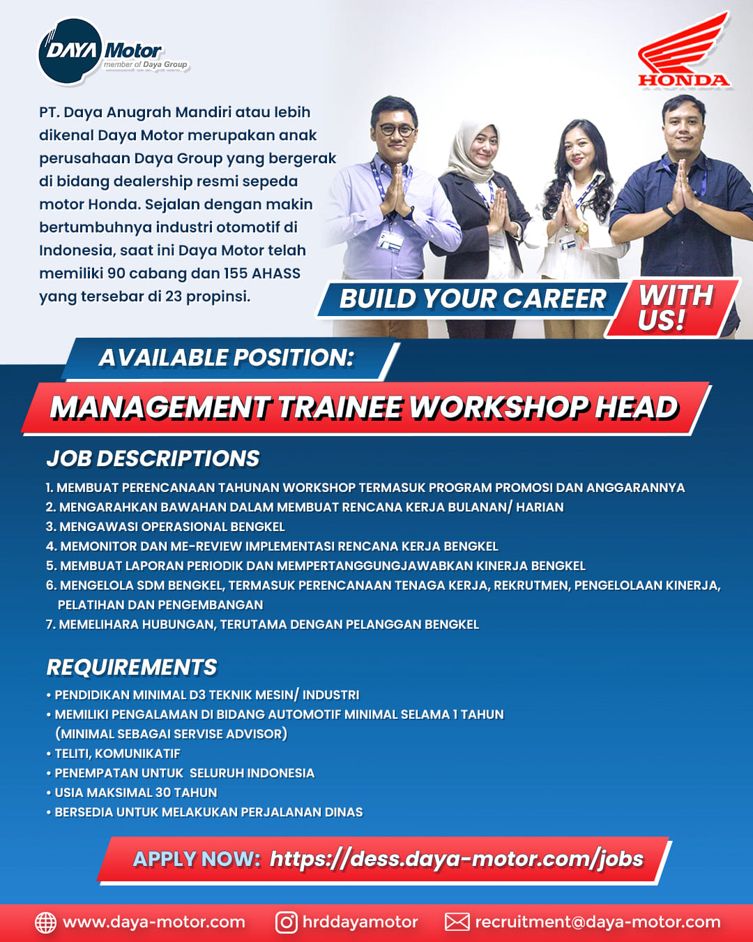 • Memiliki pengalaman di bidang Automotif minimal selama 1 tahun (minimal sebagai Servise Advisor)