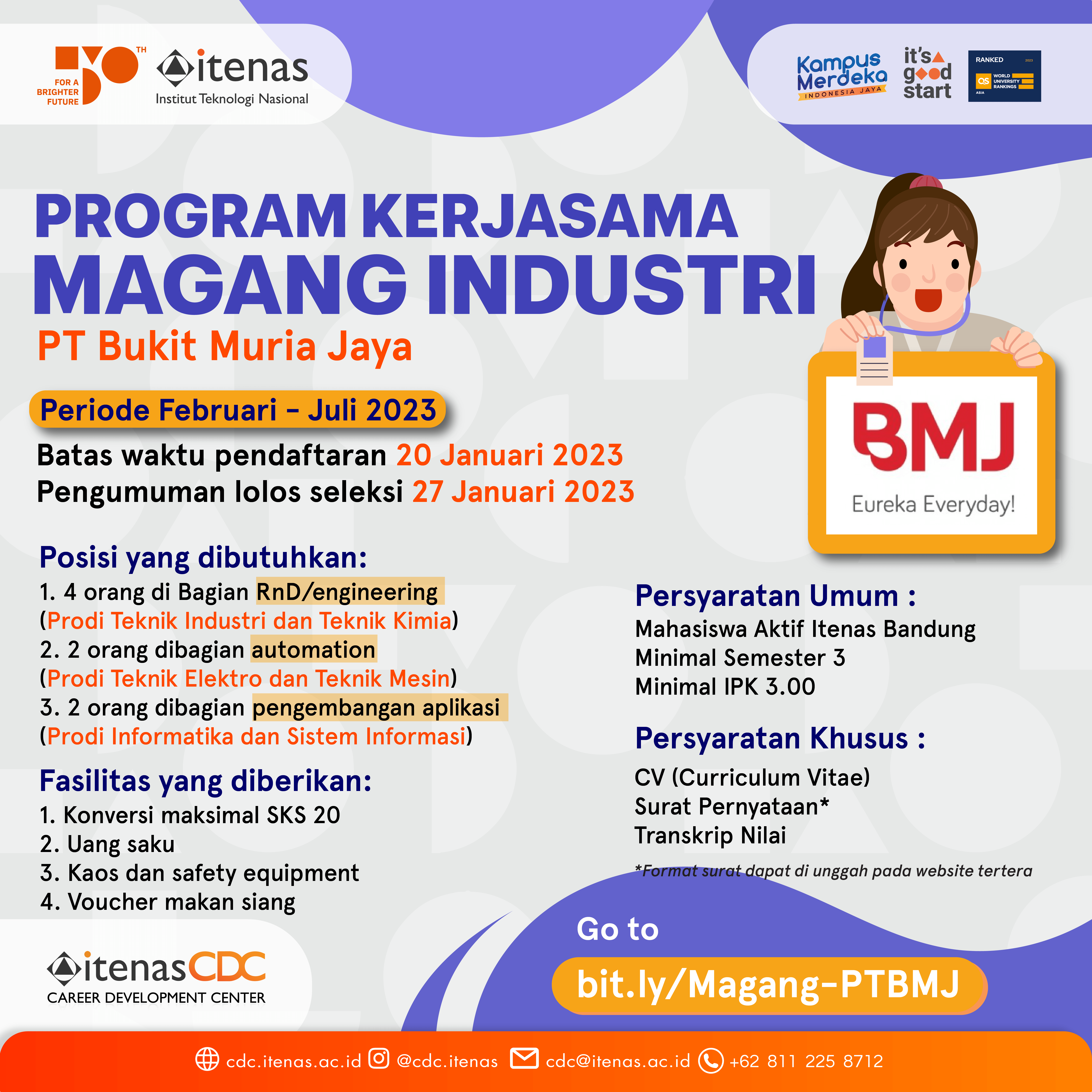 PT. Bukit Muria Jaya berdiri pada tahun 1989 sebagai salah satu perusahaan yang memproduksi kertas rokok dan pada tahun 1997 mengembangkan bisnisnya dengan membangun Divisi Packaging yang memproduksi kotak kemasan untuk produk rokok, makanan, dan juga beberapa produk seperti foil laminated paper, tiket pesawat terbang, dll. Bekerja sama dengan Itenas, PT. Bukti Muria Jaya menyediakan program magang khusus untuk mahasiswa Itenas. Peserta magang akan diberikan konversi SKS sesuai dengan masa magang yang dilaksanakan.